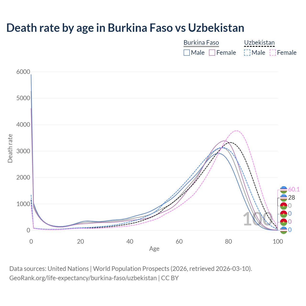 In Burkina Faso, the most common age of death is 0, compared to 81 in Uzbekistan. The median age of death is 70.4 in Burkina Faso and 76.4 in Uzbekistan, meaning only half of each cohort is expected to live past that age.