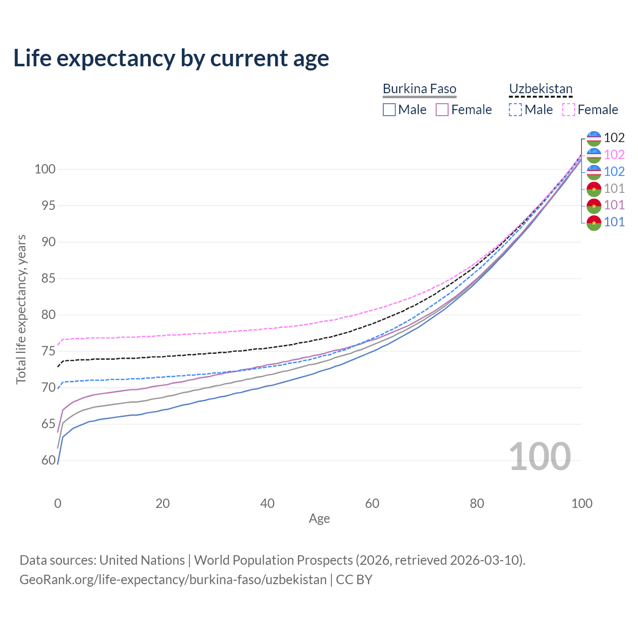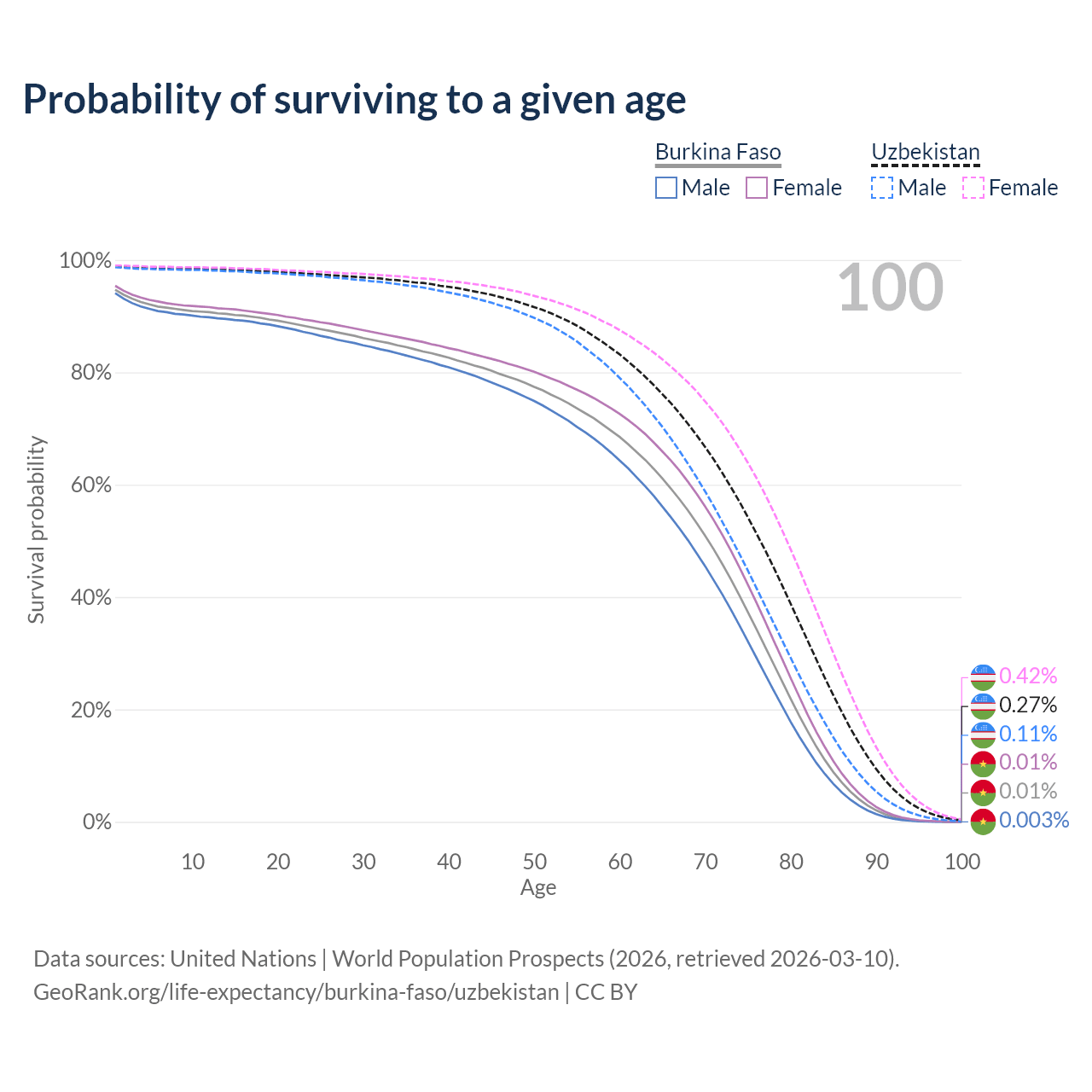This life expectancy calculator shows the odds of living to 100, 95, 90, and below based on current age for both males and females in Burkina Faso and Uzbekistan, along with mean and median age of death. The calculations are based on the 2026 life tables (actuarial tables) from the UN World Population Prospects.