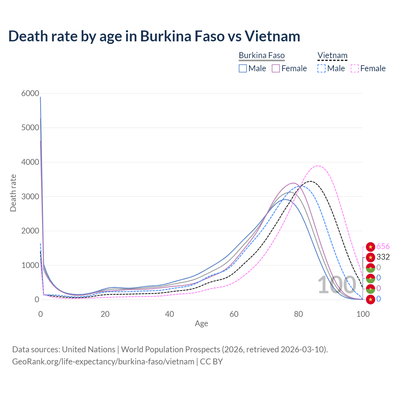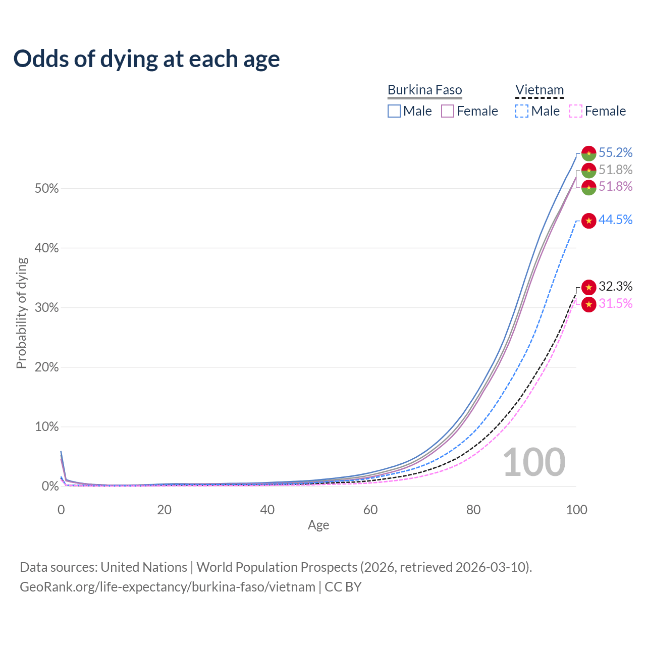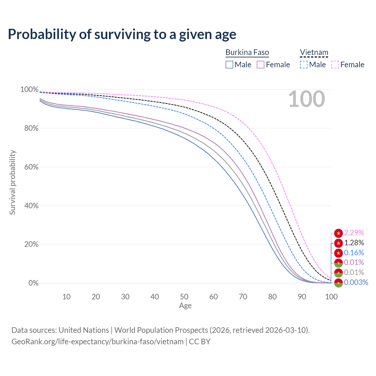 This life expectancy calculator shows the odds of living to 100, 95, 90, and below based on current age for both males and females in Burkina Faso and Vietnam, along with mean and median age of death. The calculations are based on the 2026 life tables (actuarial tables) from the UN World Population Prospects.