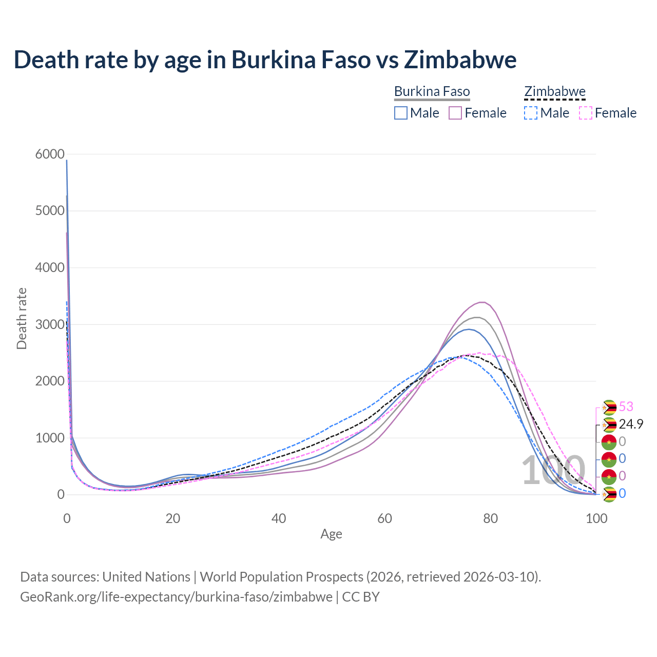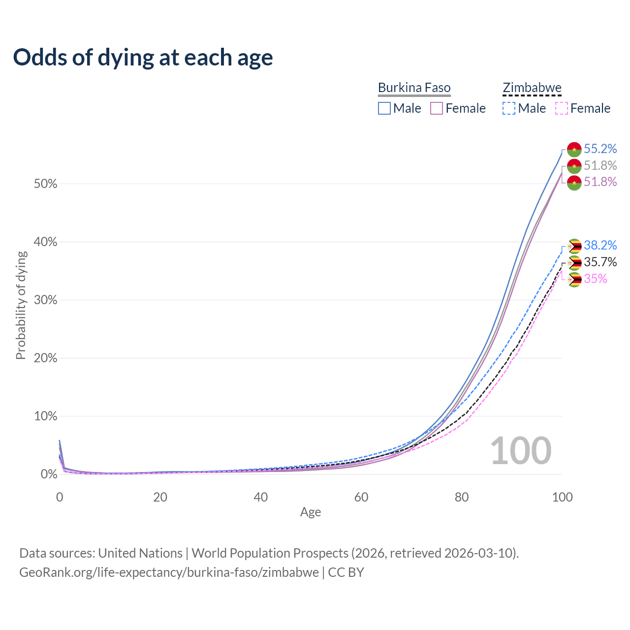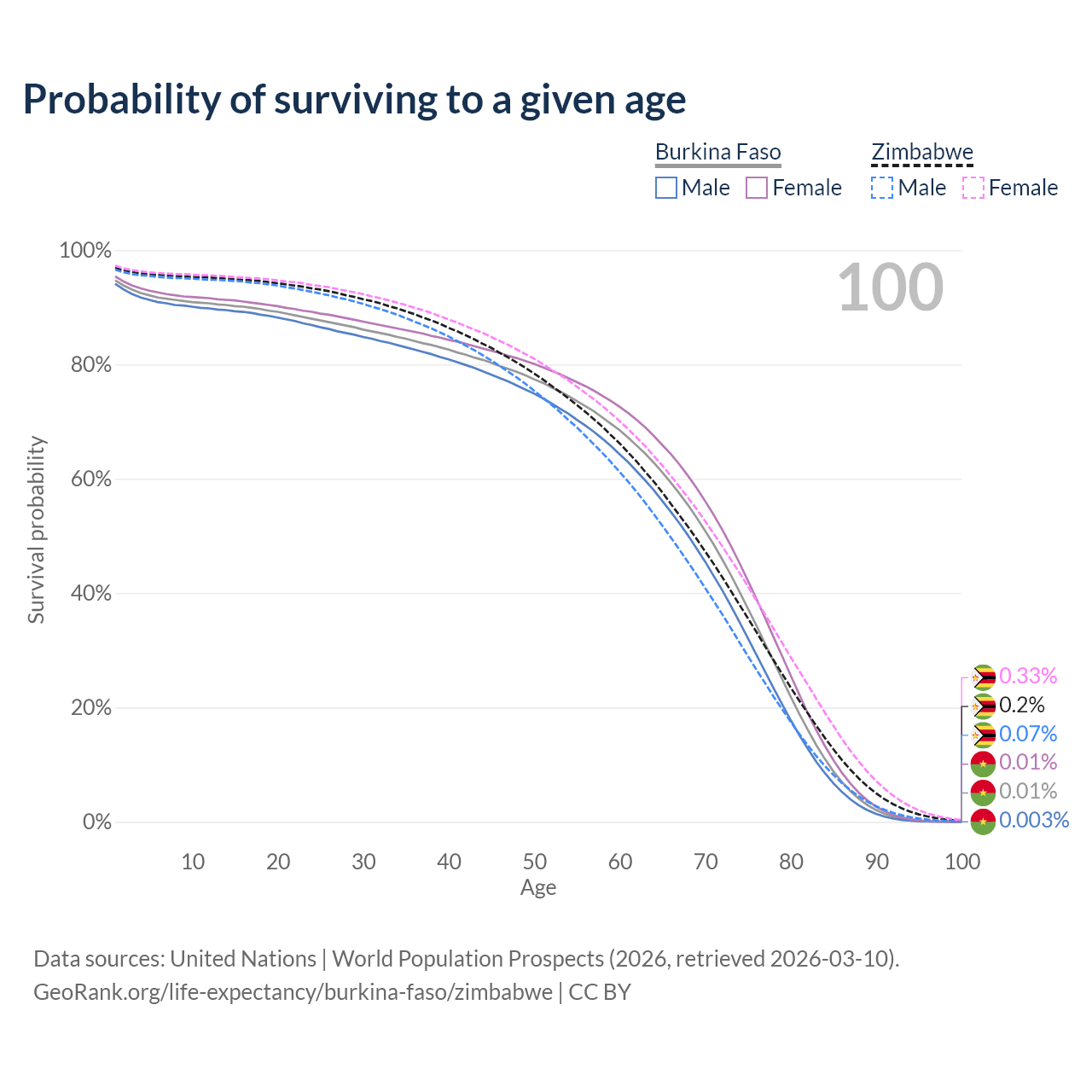 This life expectancy calculator shows the odds of living to 100, 95, 90, and below based on current age for both males and females in Burkina Faso and Zimbabwe, along with mean and median age of death. The calculations are based on the 2026 life tables (actuarial tables) from the UN World Population Prospects.