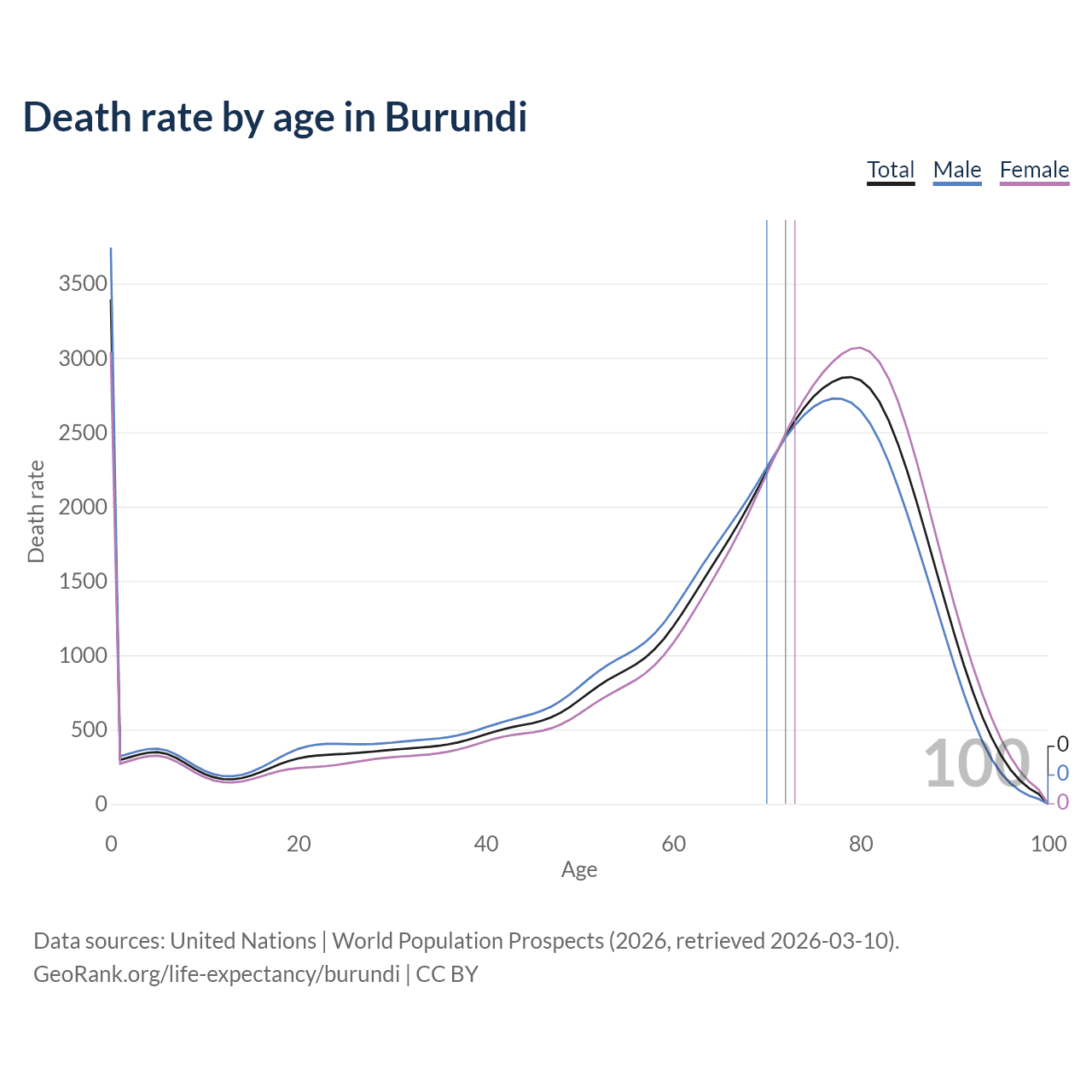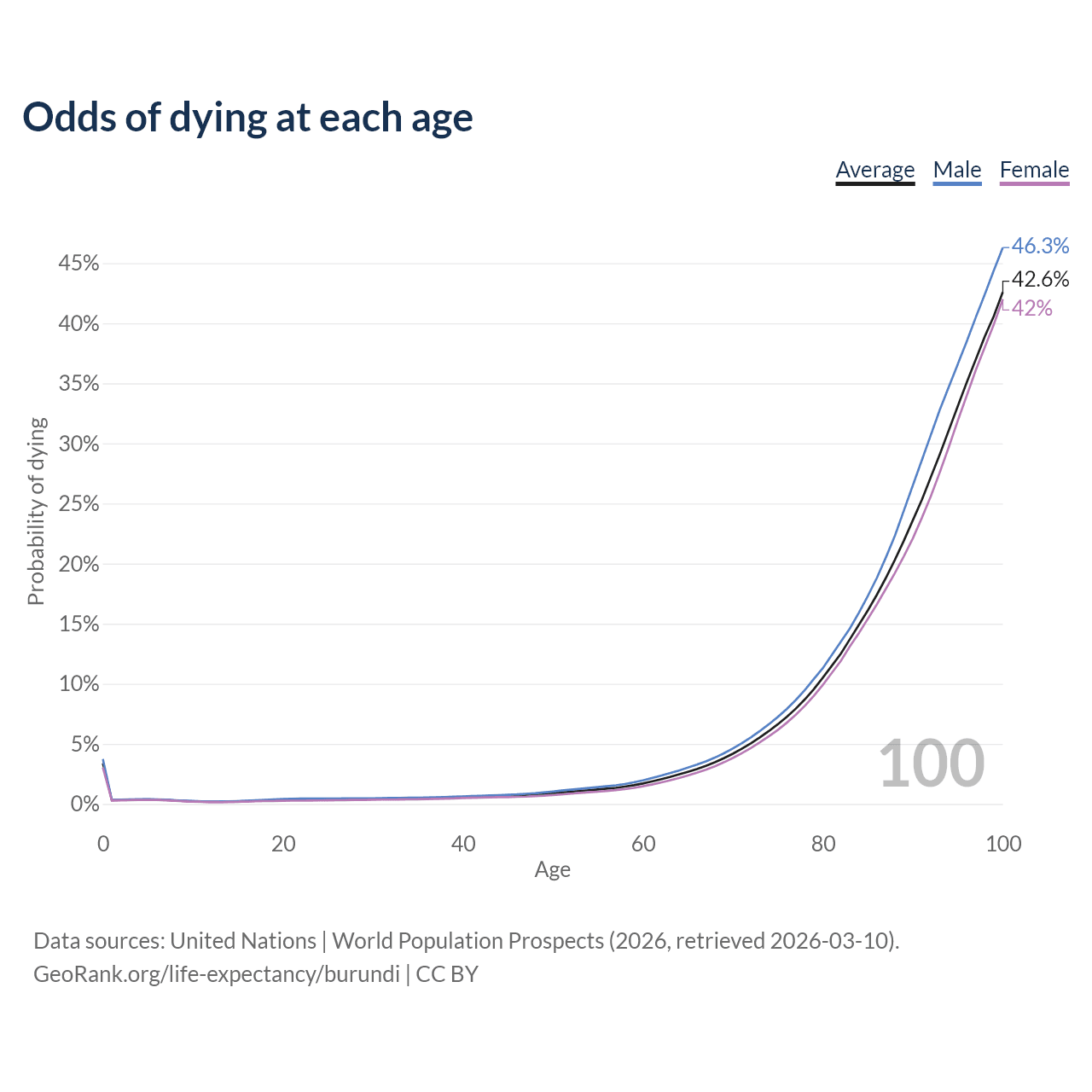 This life expectancy calculator shows the odds of living to 100, 95, 90, and below based on current age for both males and females in Burundi, along with mean and median age of death. The calculations are based on the 2026 life tables (actuarial tables) from the UN World Population Prospects.