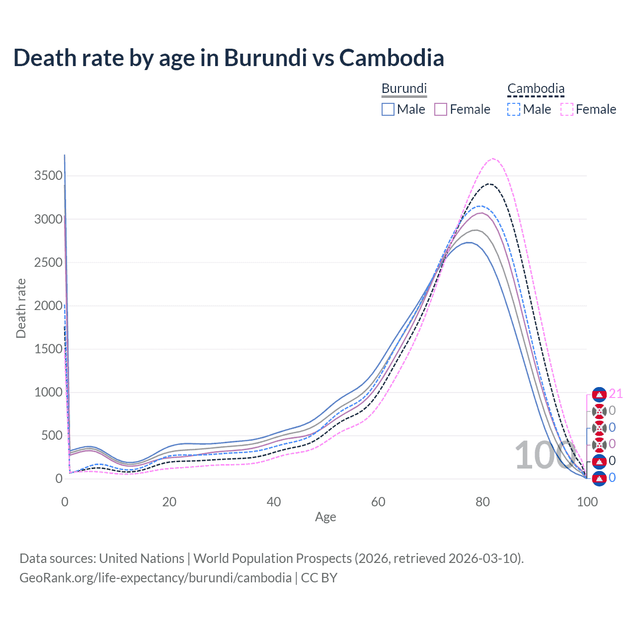 In Burundi, the most common age of death is 0, compared to 81 in Cambodia. The median age of death is 71.6 in Burundi and 76.5 in Cambodia, meaning only half of each cohort is expected to live past that age.