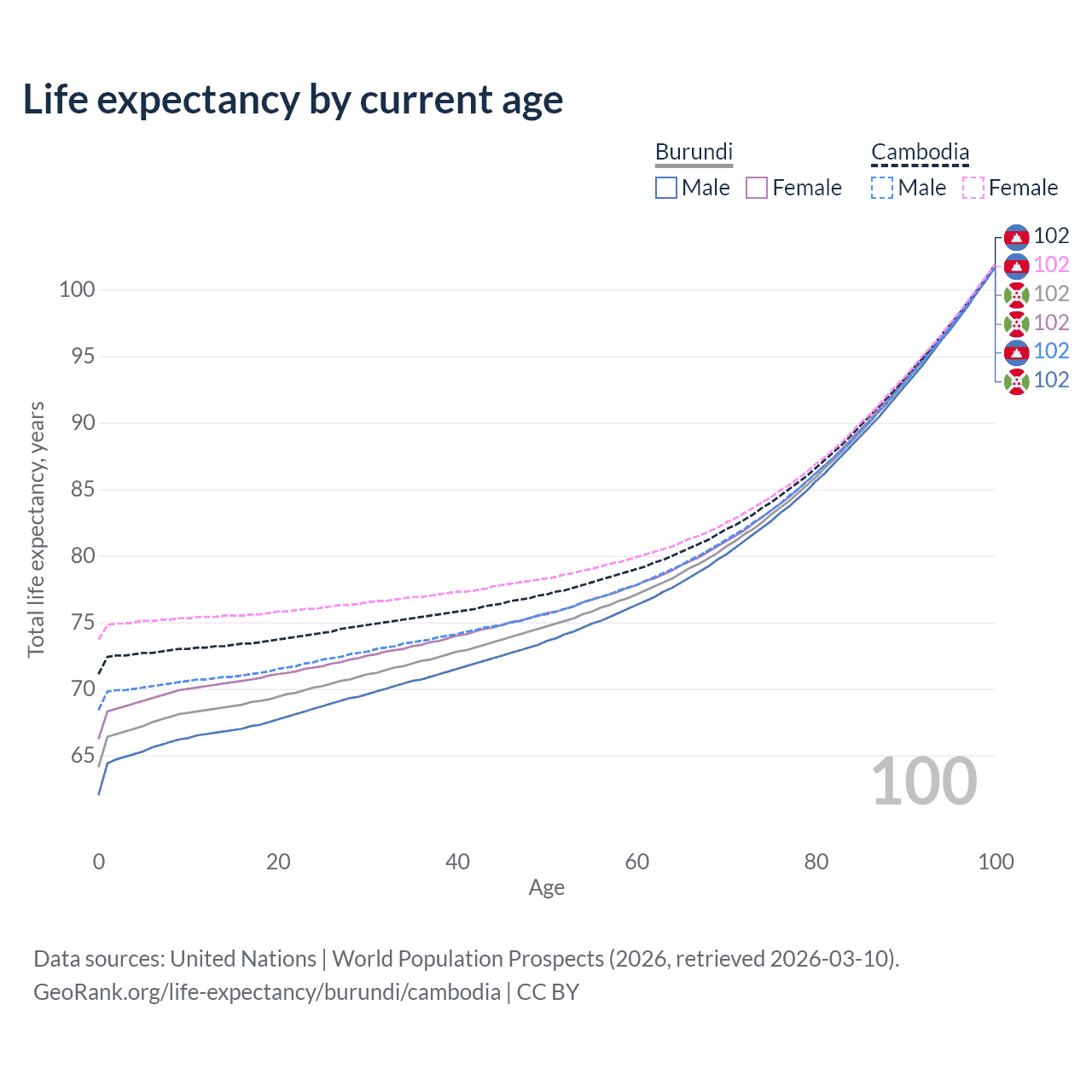 This life expectancy calculator shows the odds of living to 100, 95, 90, and below based on current age for both males and females in Burundi and Cambodia, along with mean and median age of death. The calculations are based on the 2026 life tables (actuarial tables) from the UN World Population Prospects.