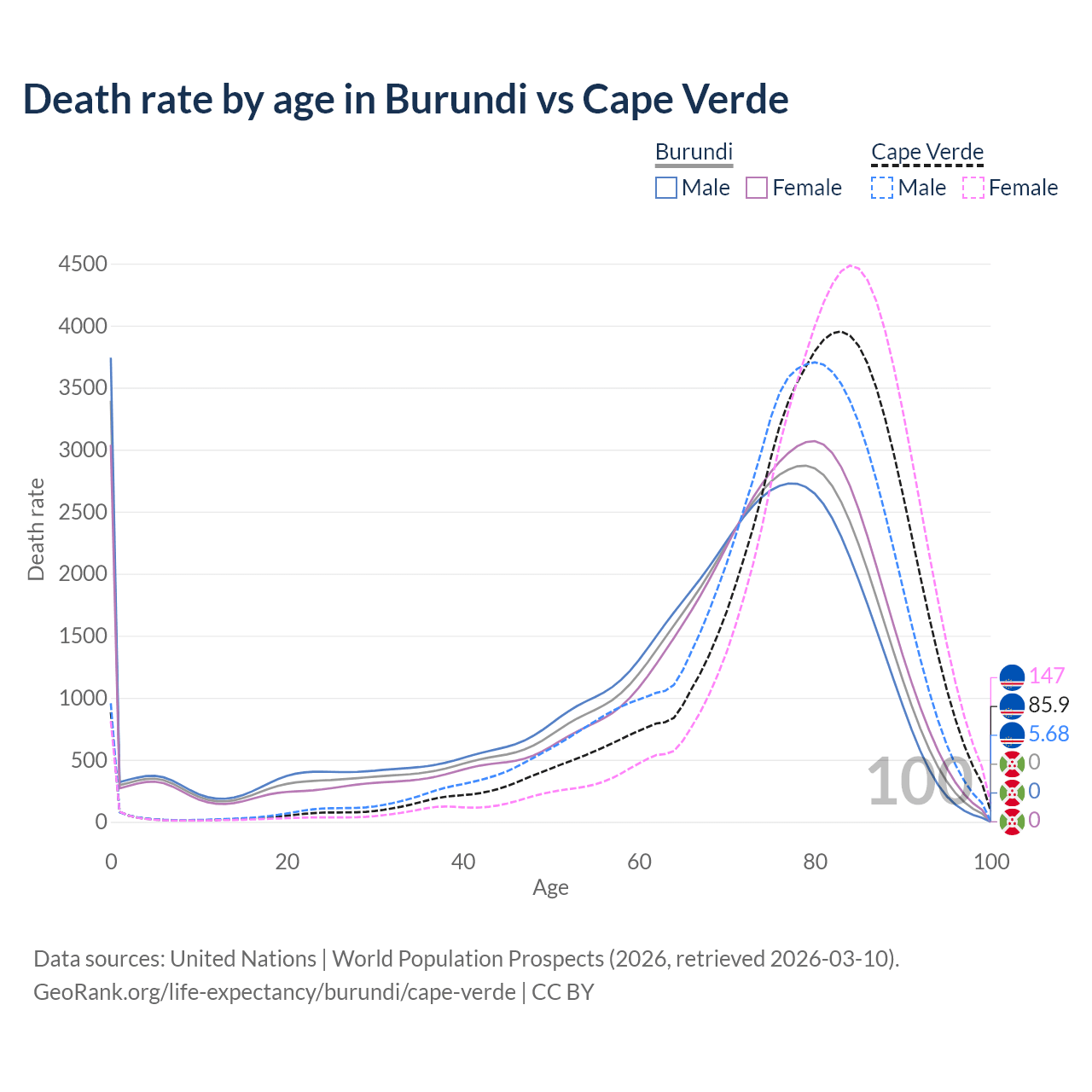 In Burundi, the most common age of death is 0, compared to 83 in Cape Verde. The median age of death is 71.6 in Burundi and 80.1 in Cape Verde, meaning only half of each cohort is expected to live past that age.
