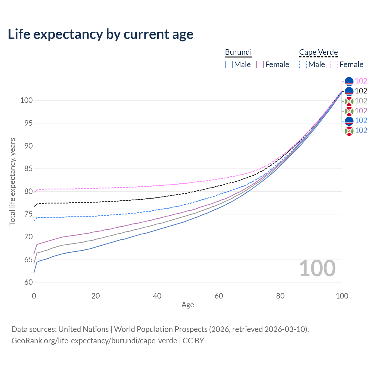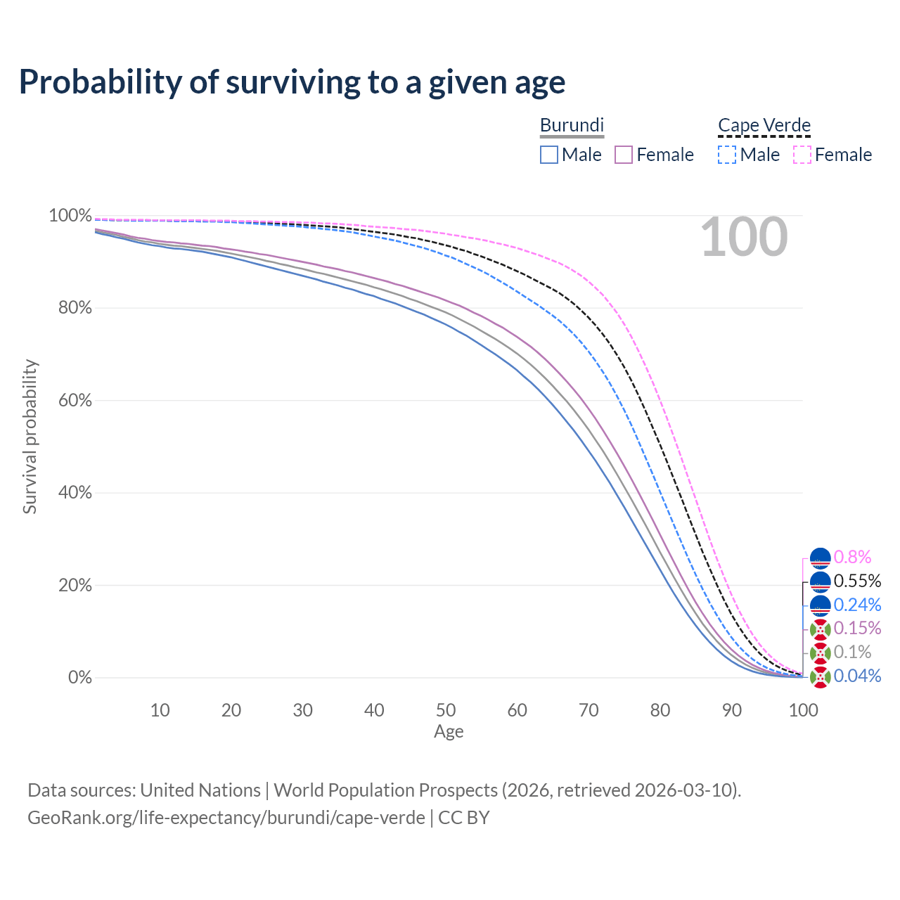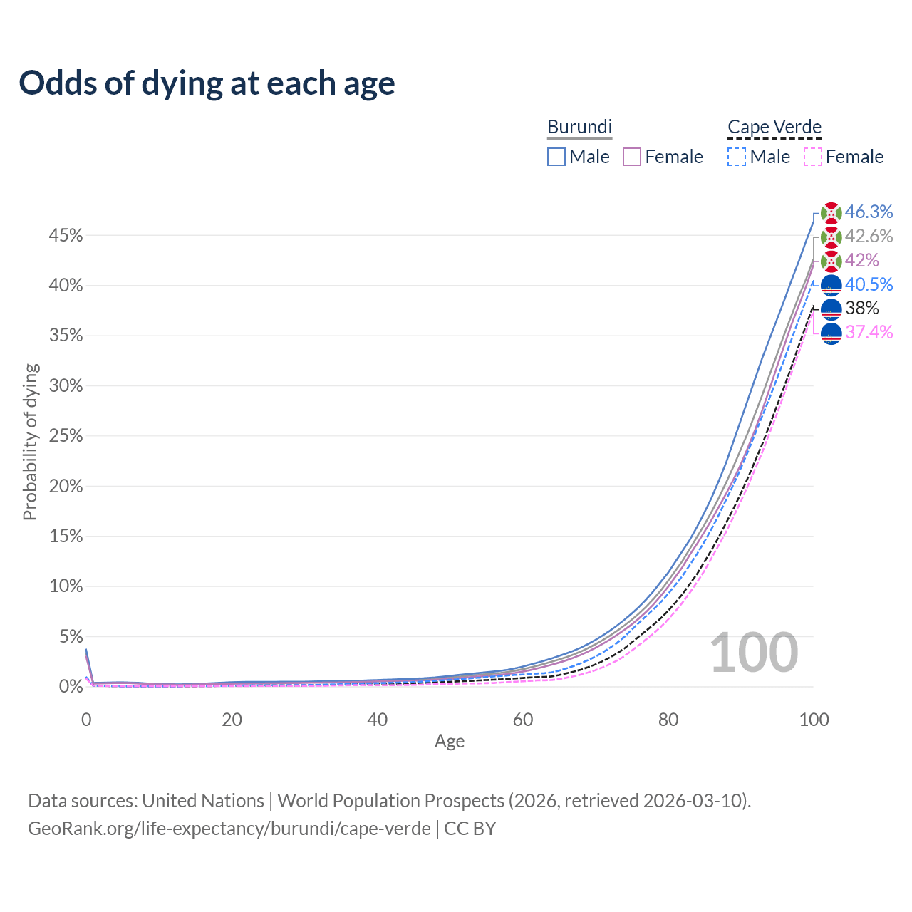 This life expectancy calculator shows the odds of living to 100, 95, 90, and below based on current age for both males and females in Burundi and Cape Verde, along with mean and median age of death. The calculations are based on the 2026 life tables (actuarial tables) from the UN World Population Prospects.