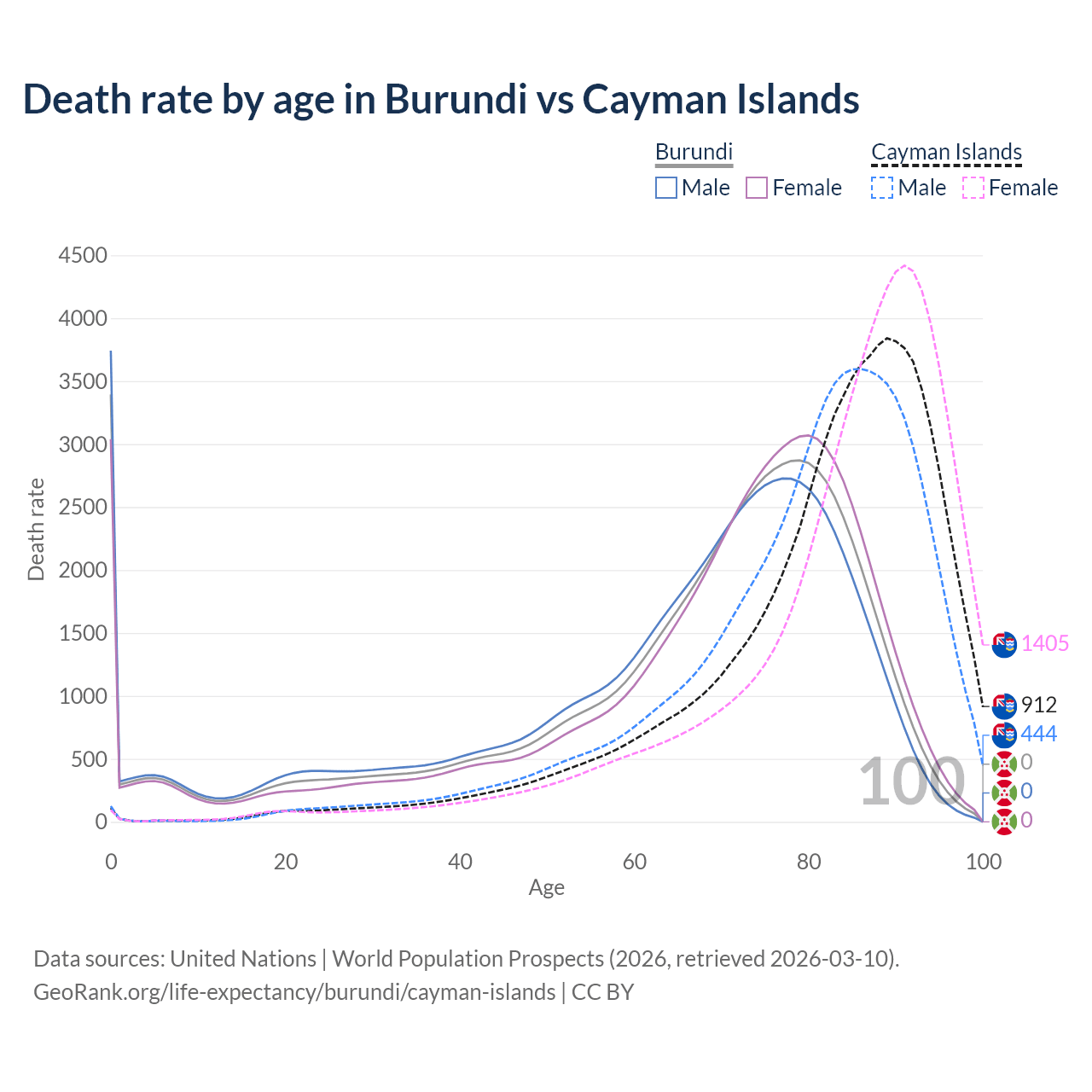 In Burundi, the most common age of death is 0, compared to 89 in the Cayman Islands. The median age of death is 71.6 in Burundi and 84.9 in the Cayman Islands, meaning only half of each cohort is expected to live past that age.