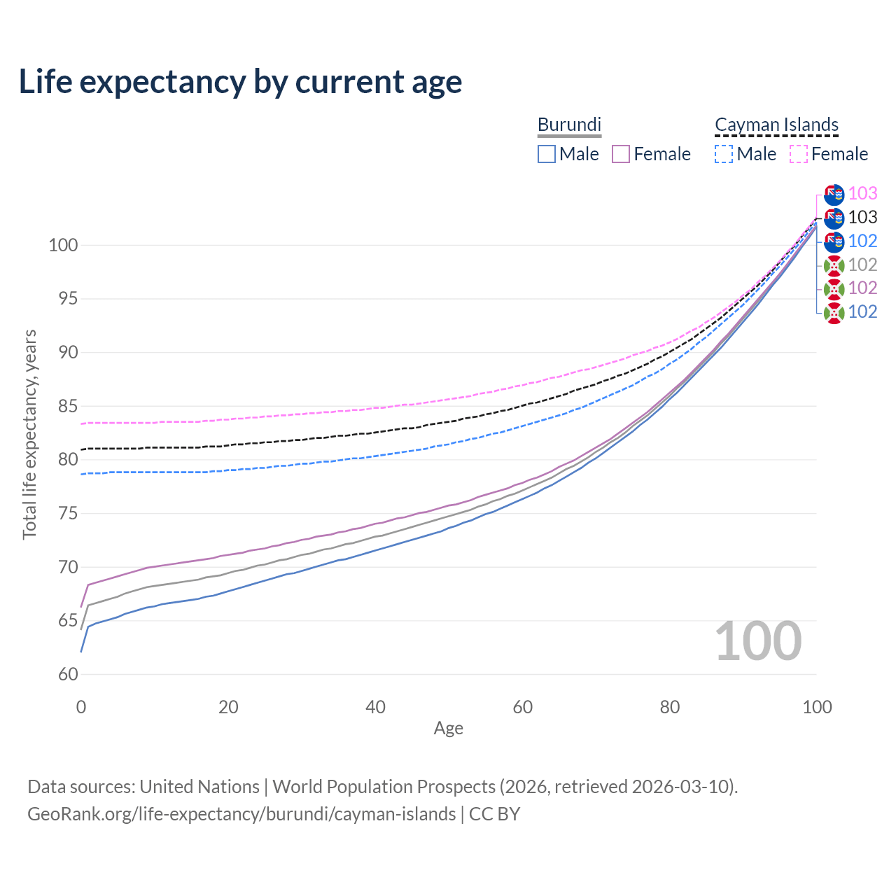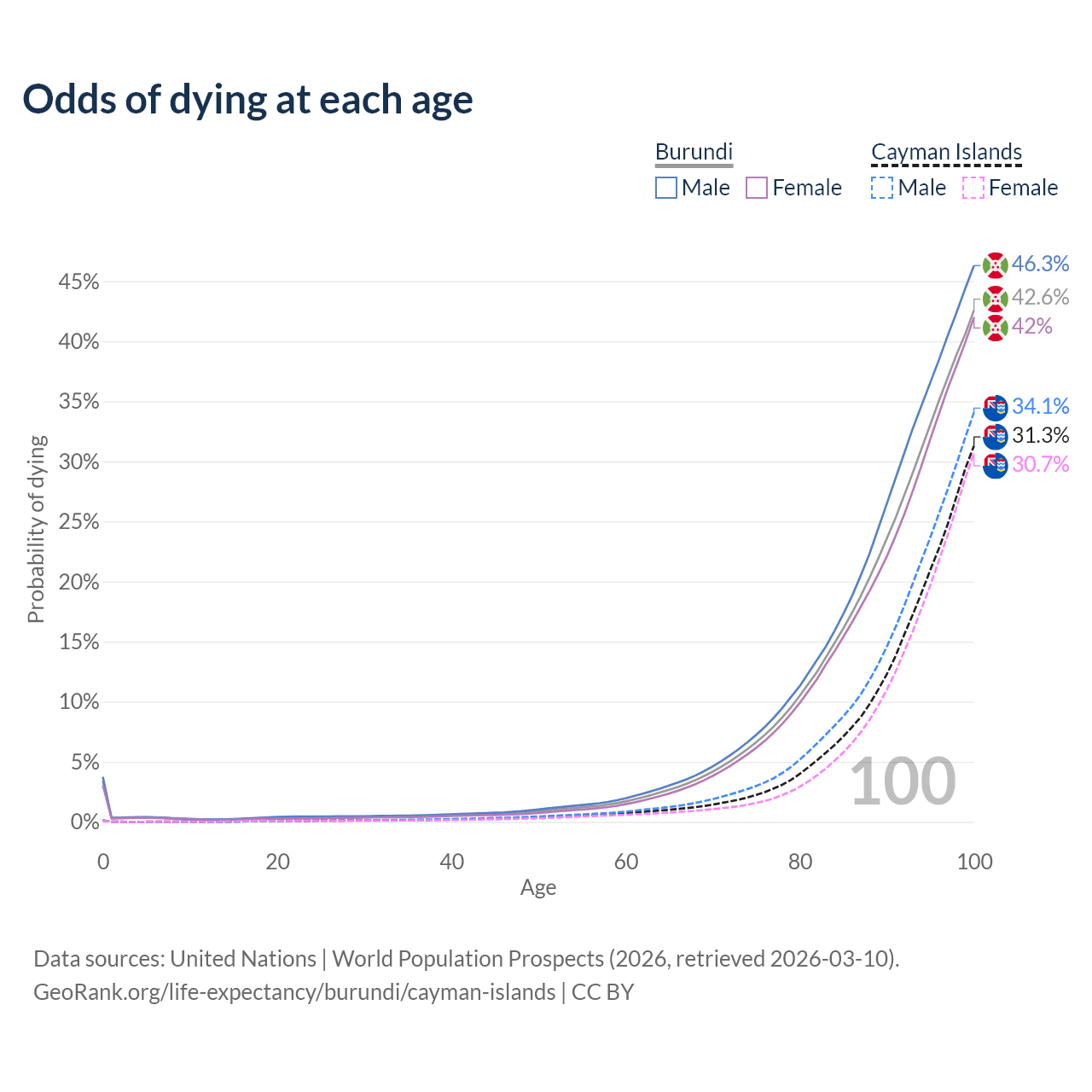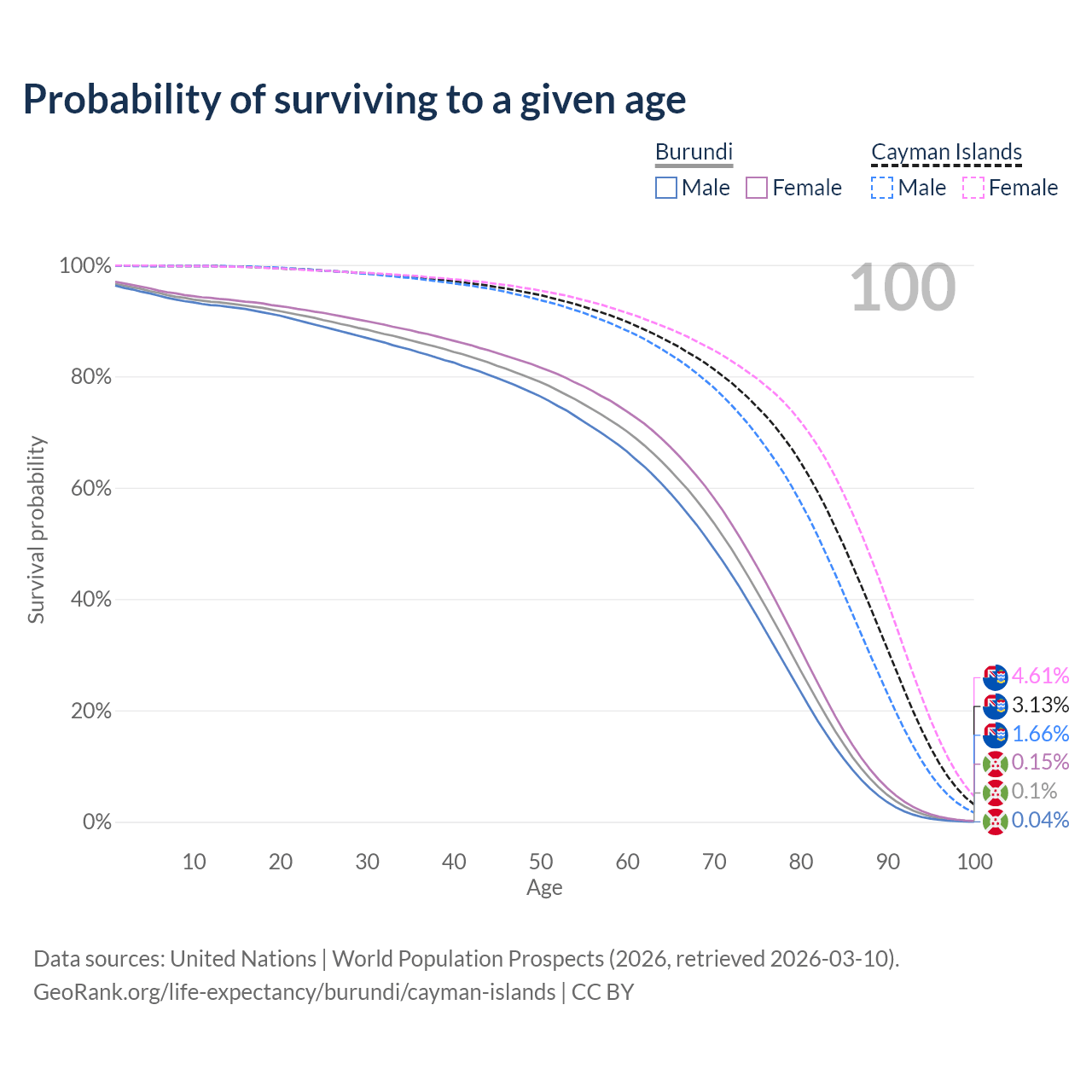 This life expectancy calculator shows the odds of living to 100, 95, 90, and below based on current age for both males and females in Burundi and the Cayman Islands, along with mean and median age of death. The calculations are based on the 2026 life tables (actuarial tables) from the UN World Population Prospects.
