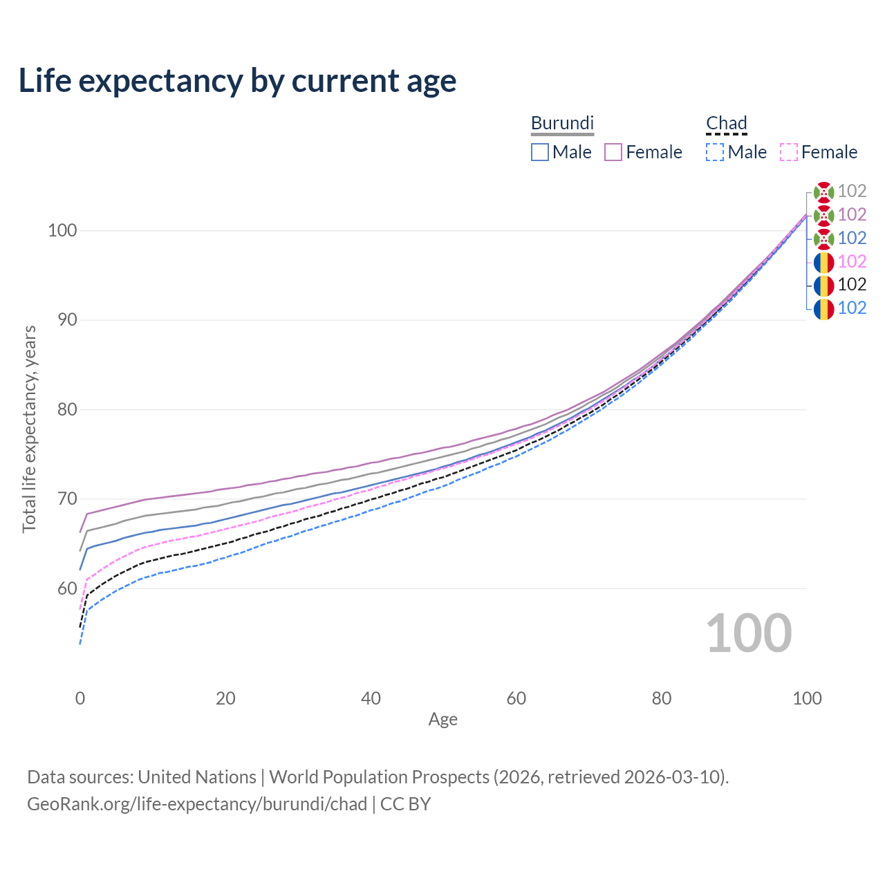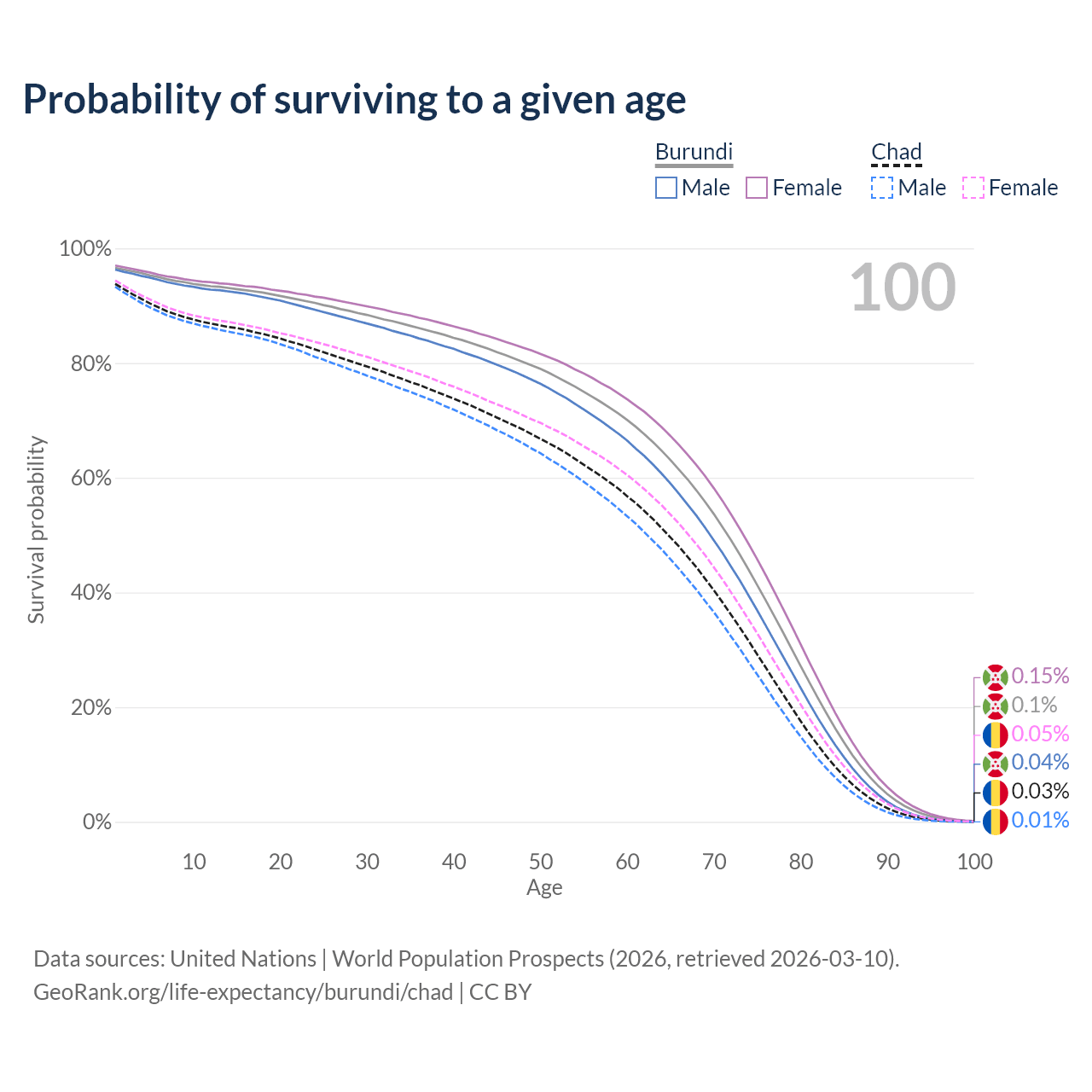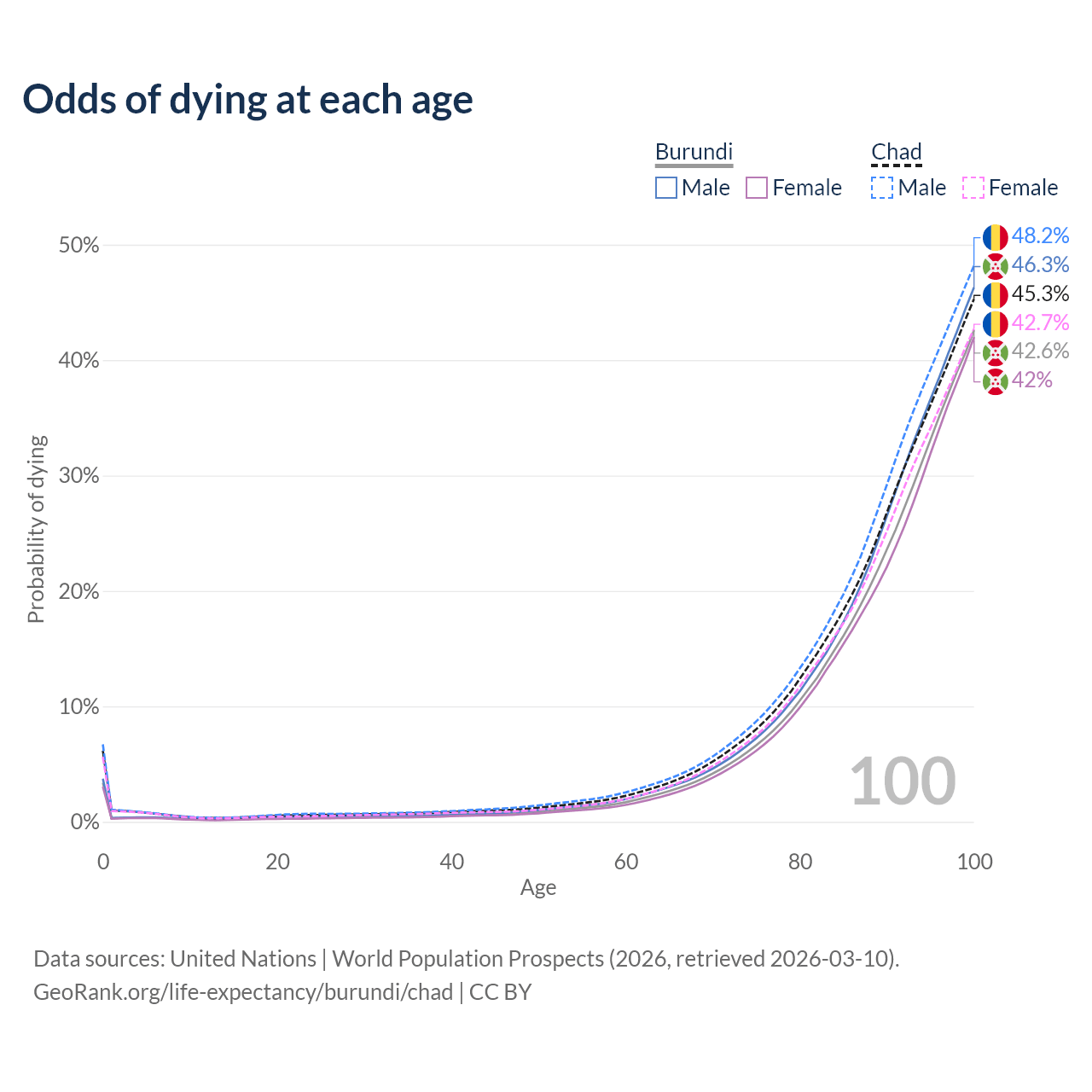 This life expectancy calculator shows the odds of living to 100, 95, 90, and below based on current age for both males and females in Burundi and Chad, along with mean and median age of death. The calculations are based on the 2026 life tables (actuarial tables) from the UN World Population Prospects.