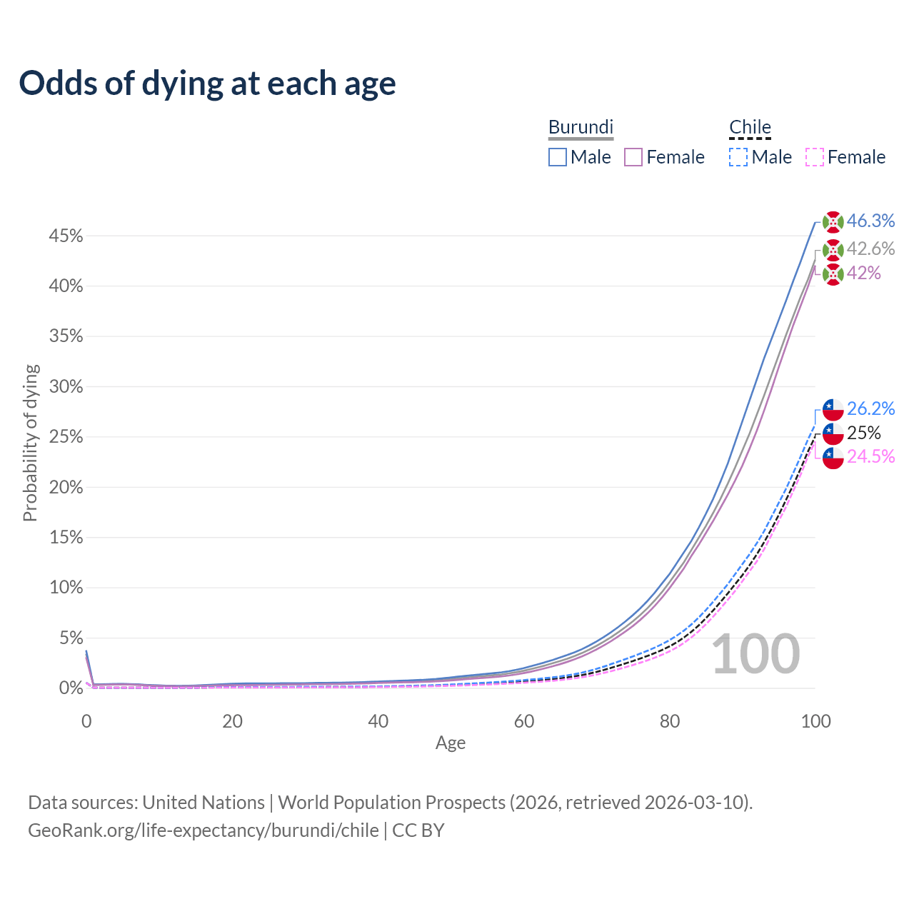 This life expectancy calculator shows the odds of living to 100, 95, 90, and below based on current age for both males and females in Burundi and Chile, along with mean and median age of death. The calculations are based on the 2026 life tables (actuarial tables) from the UN World Population Prospects.