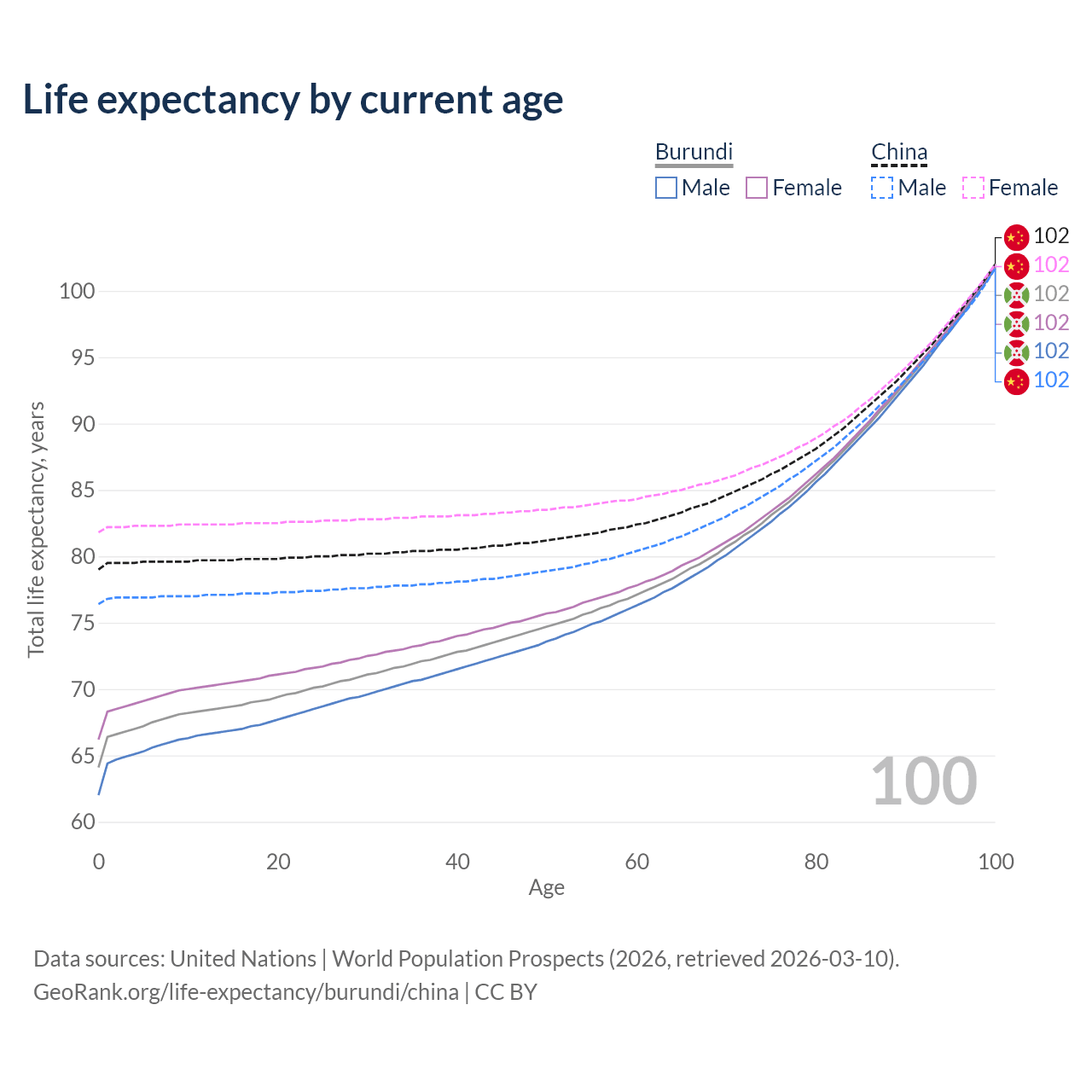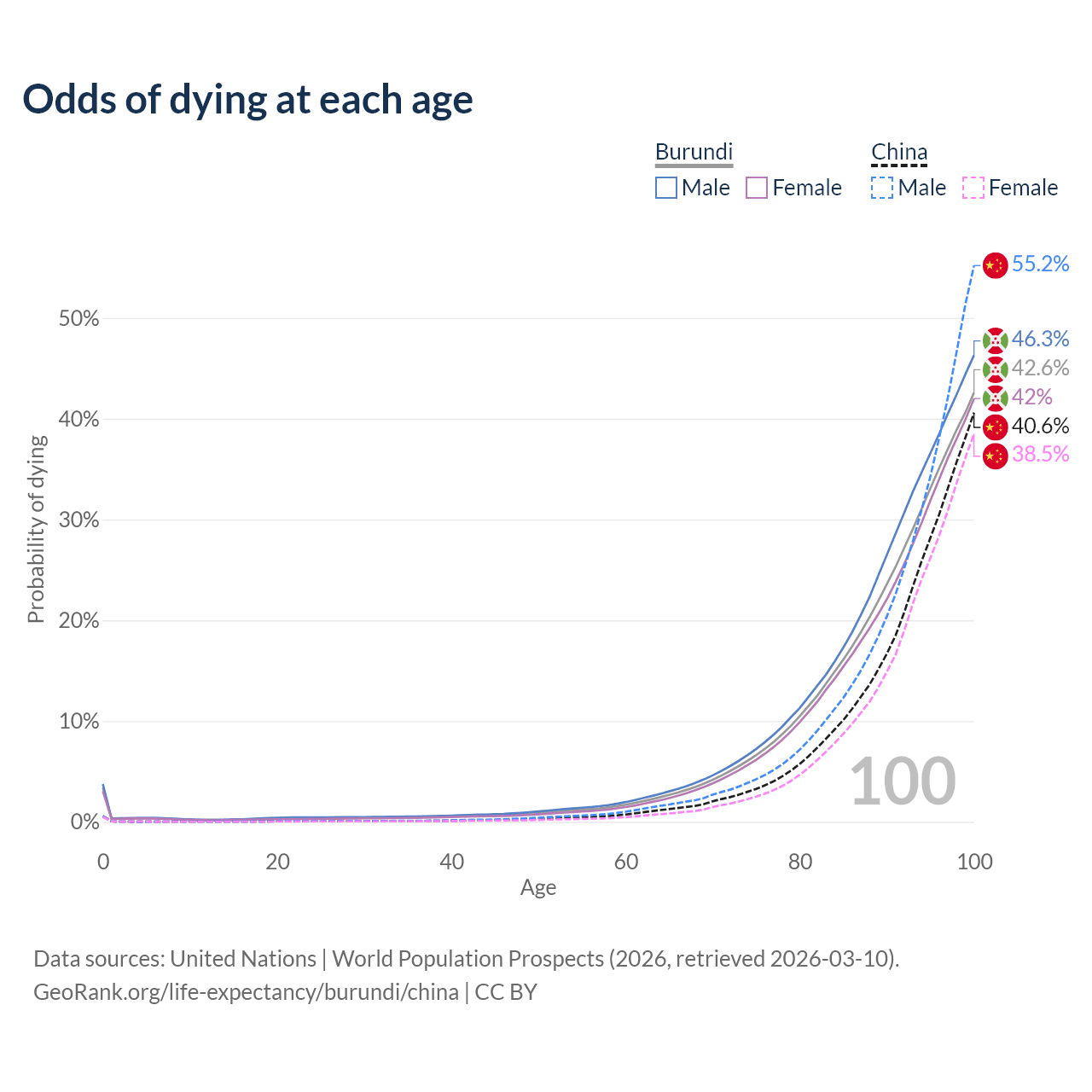 This life expectancy calculator shows the odds of living to 100, 95, 90, and below based on current age for both males and females in Burundi and China, along with mean and median age of death. The calculations are based on the 2026 life tables (actuarial tables) from the UN World Population Prospects.