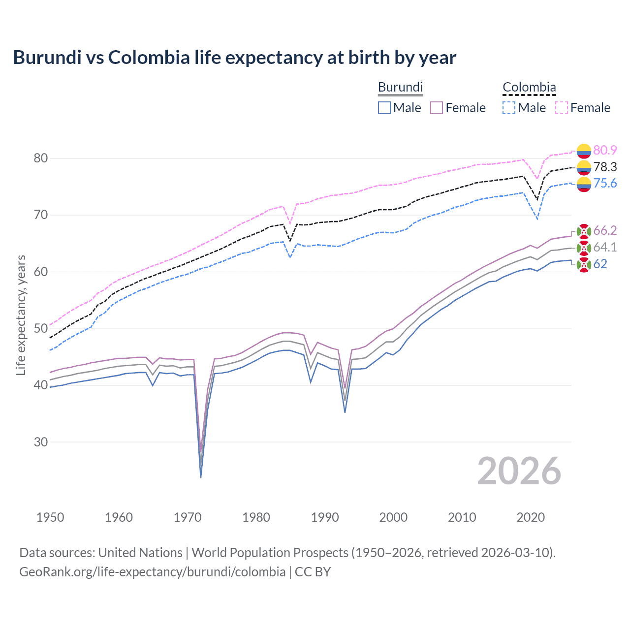 The average life expectancy at birth is 64.1 years in Burundi vs 78.3 in Colombia. Burundi is ranked 179/197 by life expectancy, and Colombia is 60/197. In Burundi, the life expectancy is 62 years for males and 66.2 years for females. In Colombia, it's 75.6 years for males and 80.9 years for females.