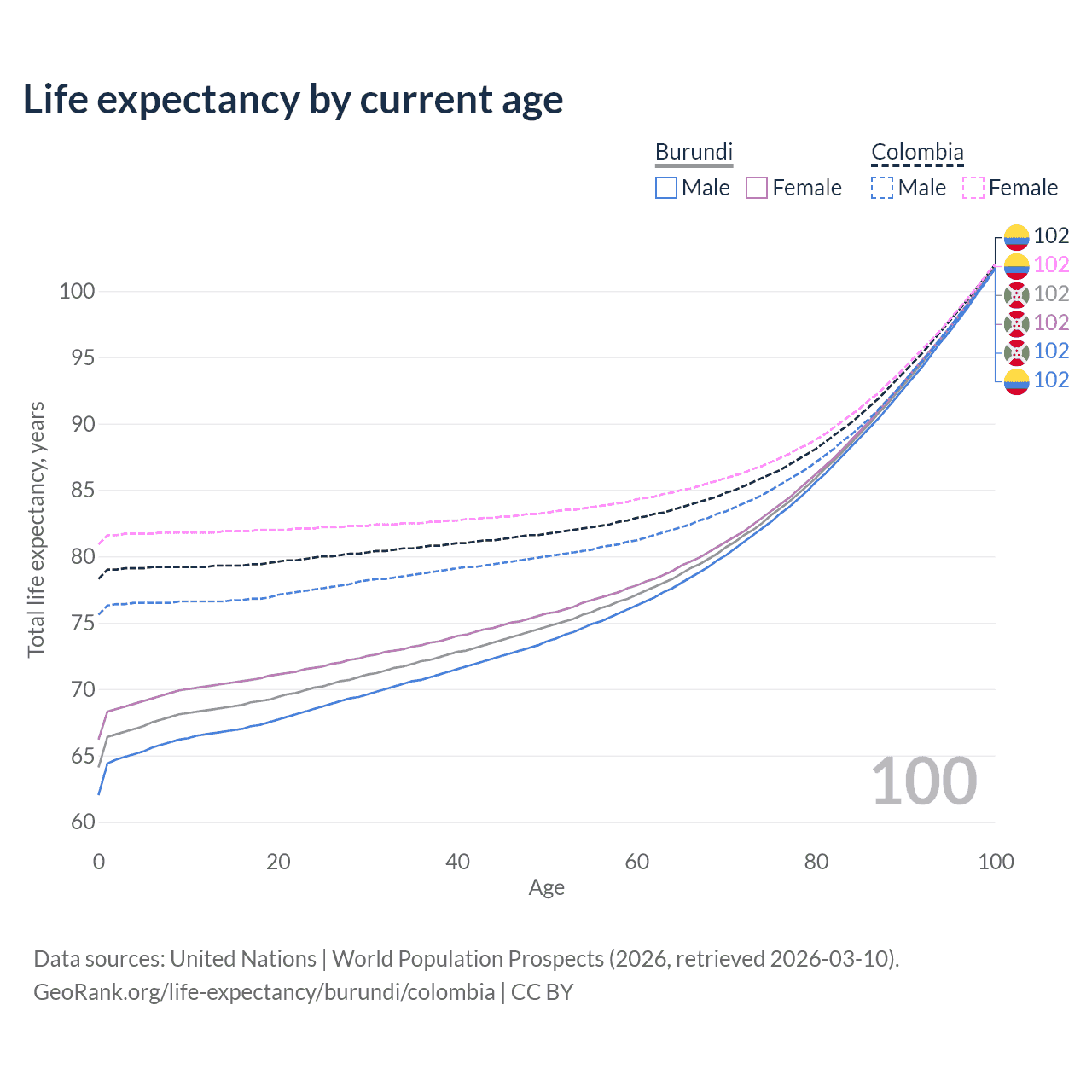 This life expectancy calculator shows the odds of living to 100, 95, 90, and below based on current age for both males and females in Burundi and Colombia, along with mean and median age of death. The calculations are based on the 2026 life tables (actuarial tables) from the UN World Population Prospects.