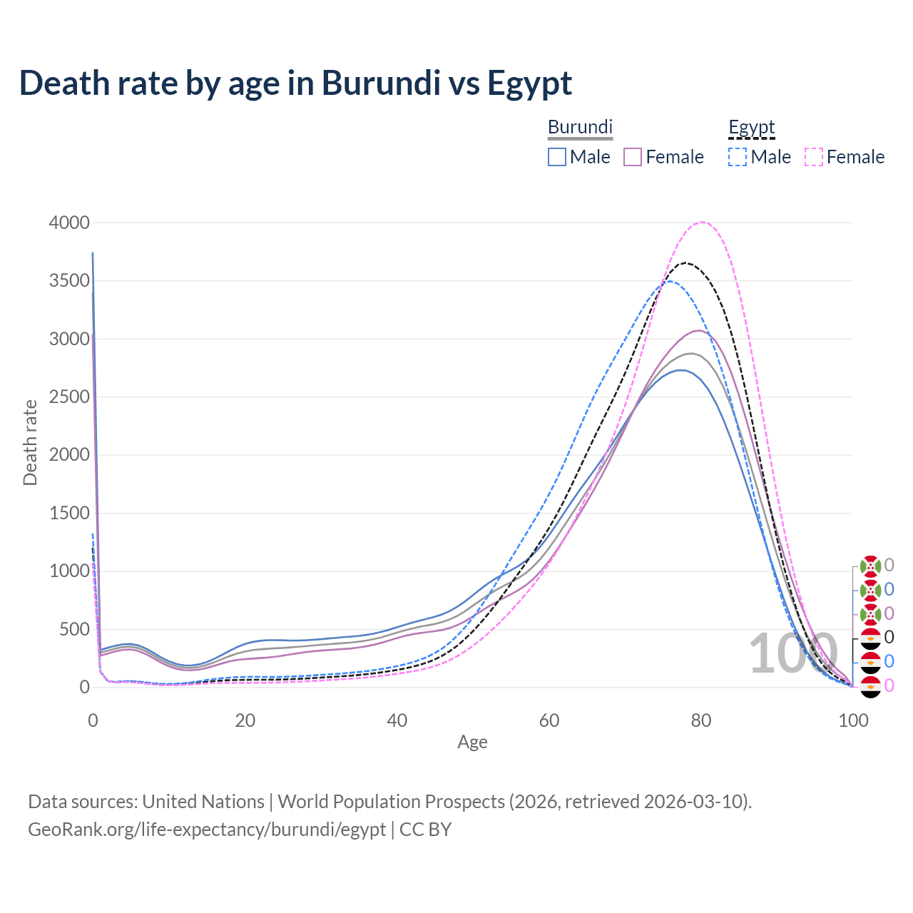 In Burundi, the most common age of death is 0, compared to 78 in Egypt. The median age of death is 71.6 in Burundi and 75.2 in Egypt, meaning only half of each cohort is expected to live past that age.