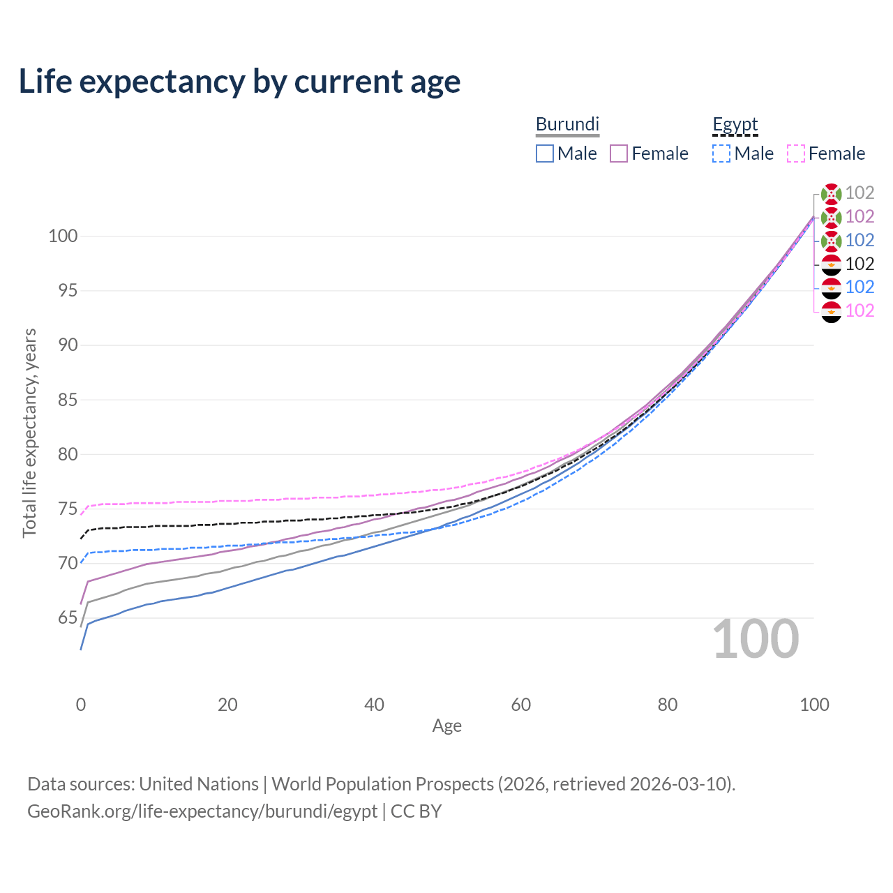 This life expectancy calculator shows the odds of living to 100, 95, 90, and below based on current age for both males and females in Burundi and Egypt, along with mean and median age of death. The calculations are based on the 2026 life tables (actuarial tables) from the UN World Population Prospects.
