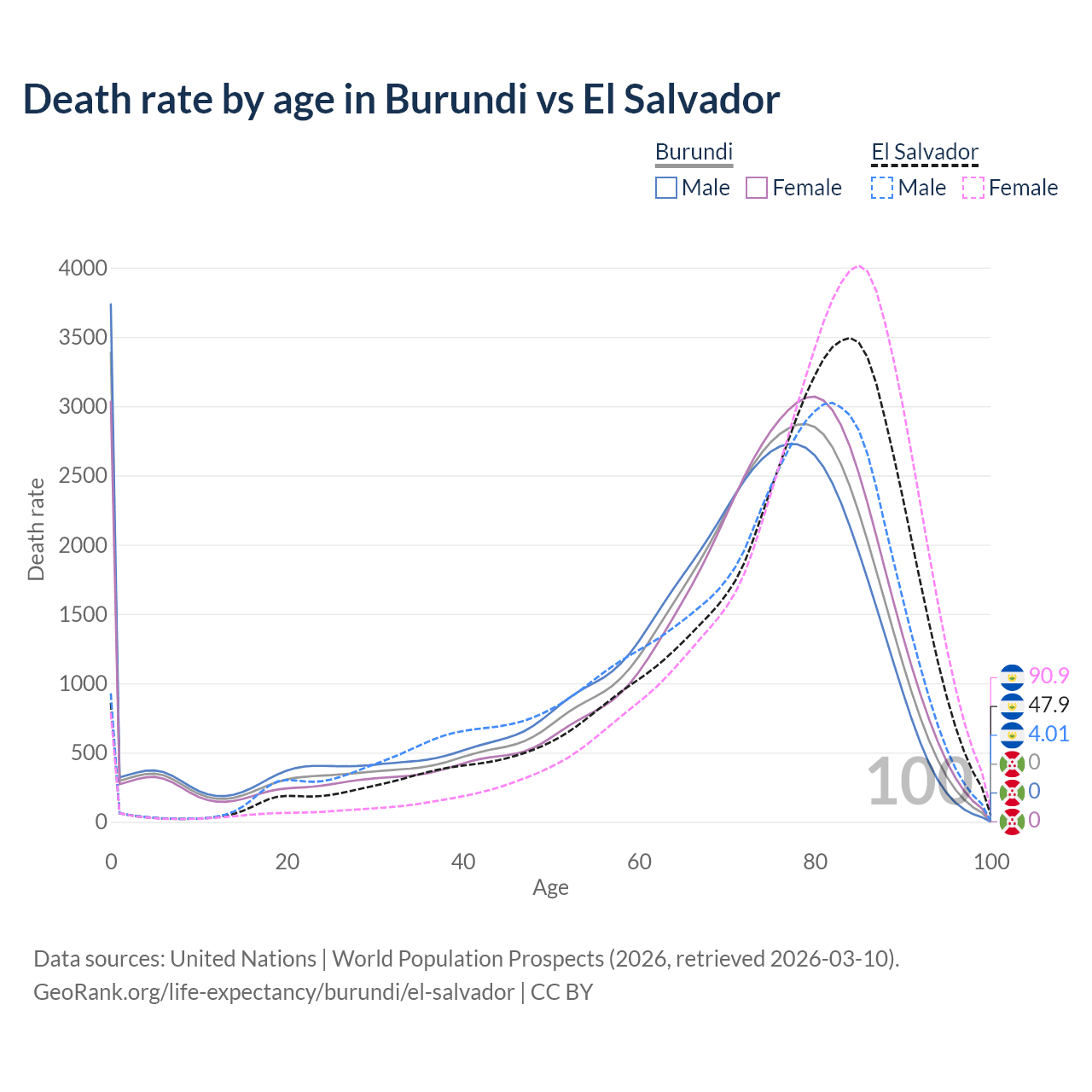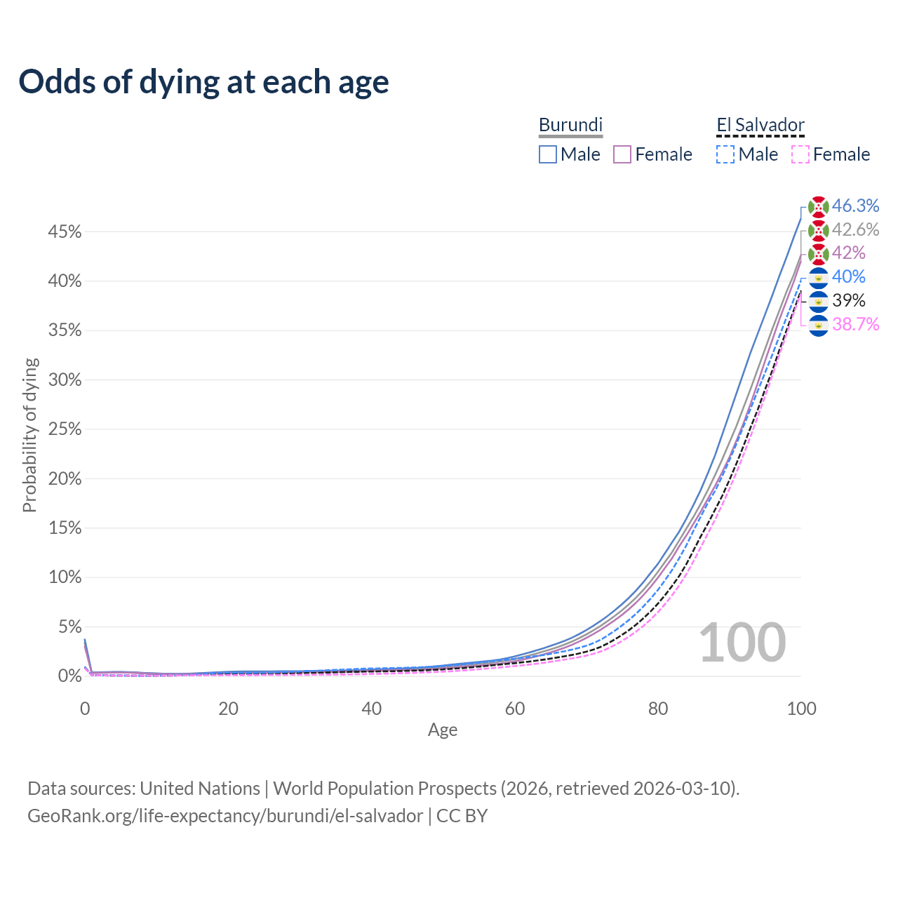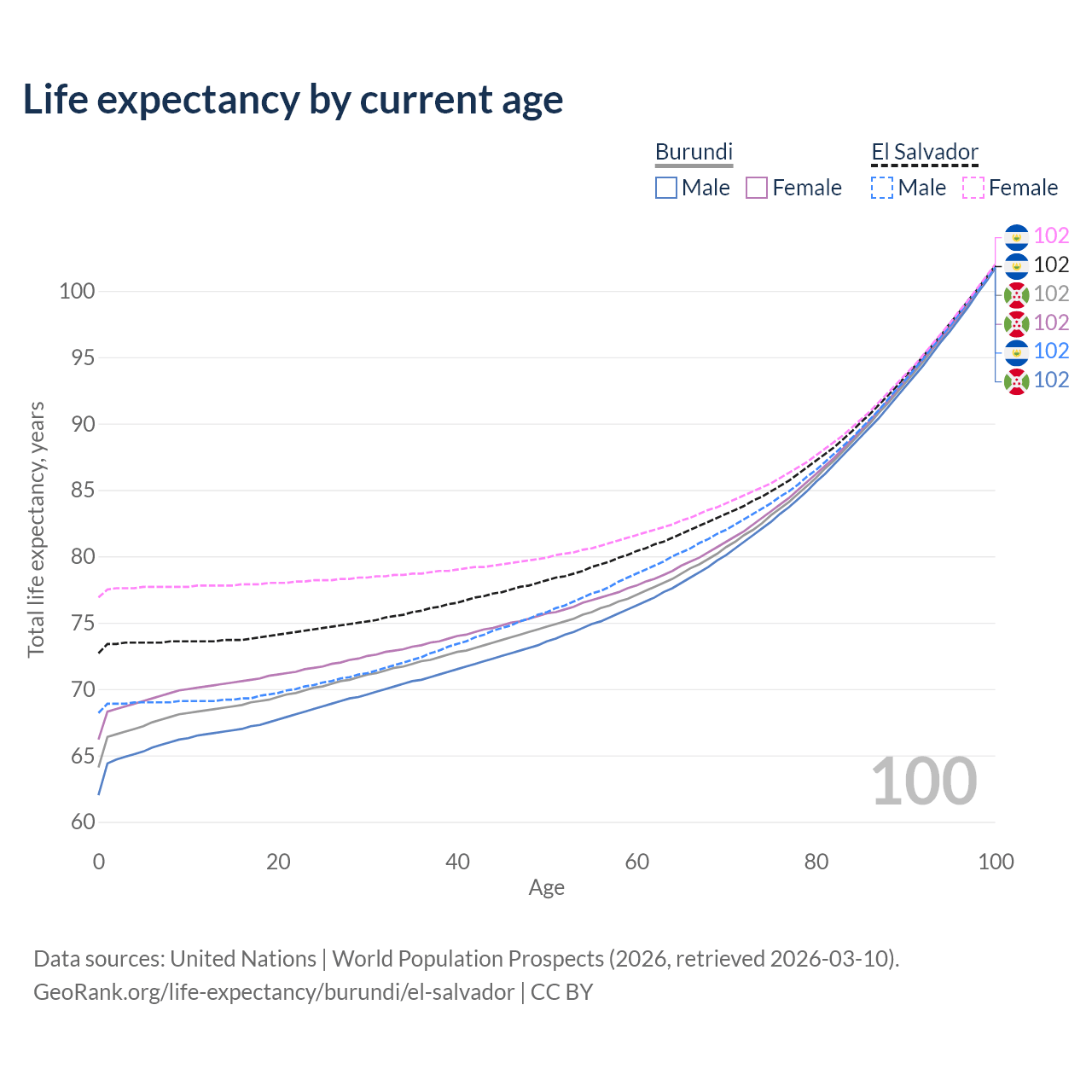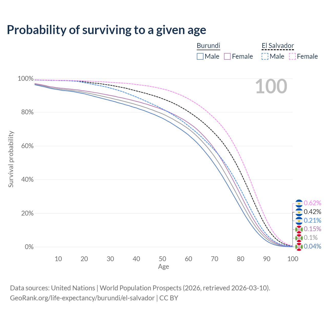 This life expectancy calculator shows the odds of living to 100, 95, 90, and below based on current age for both males and females in Burundi and El Salvador, along with mean and median age of death. The calculations are based on the 2026 life tables (actuarial tables) from the UN World Population Prospects.