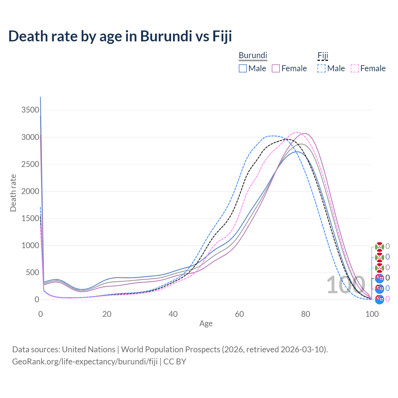 In Burundi, the most common age of death is 0, compared to 74 in Fiji. The median age of death is 71.6 in Burundi and 70.5 in Fiji, meaning only half of each cohort is expected to live past that age.