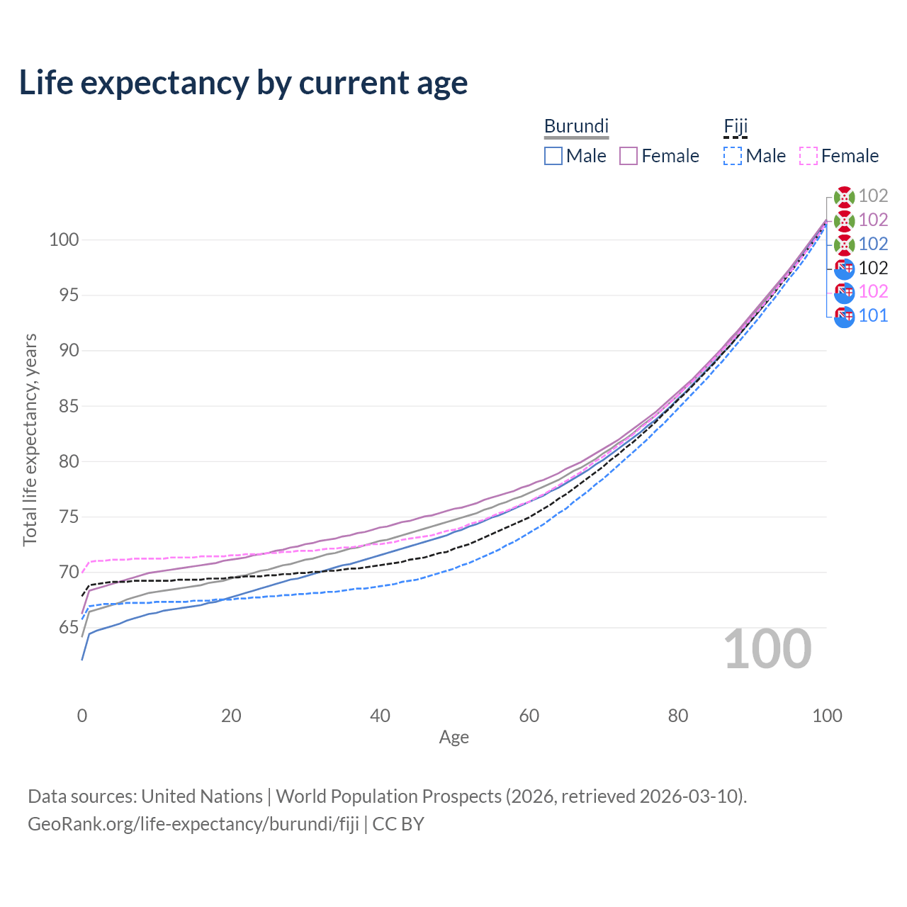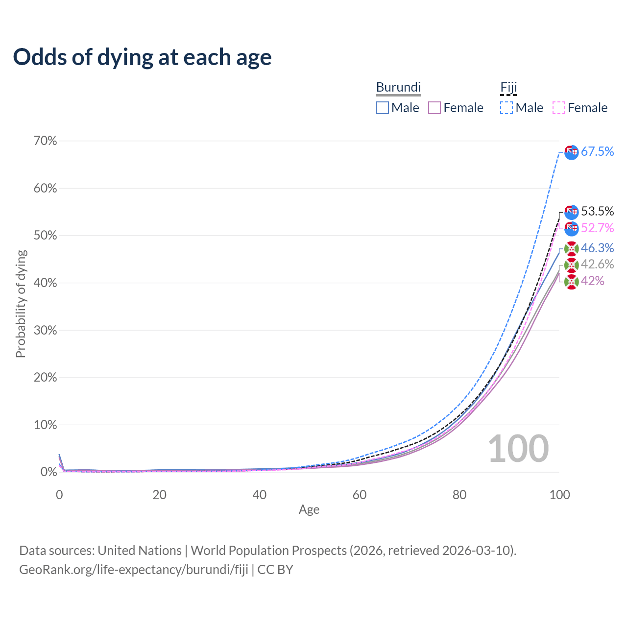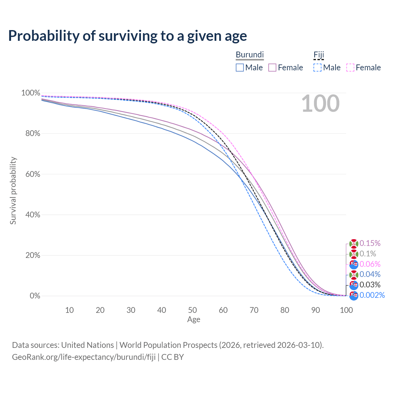 This life expectancy calculator shows the odds of living to 100, 95, 90, and below based on current age for both males and females in Burundi and Fiji, along with mean and median age of death. The calculations are based on the 2026 life tables (actuarial tables) from the UN World Population Prospects.