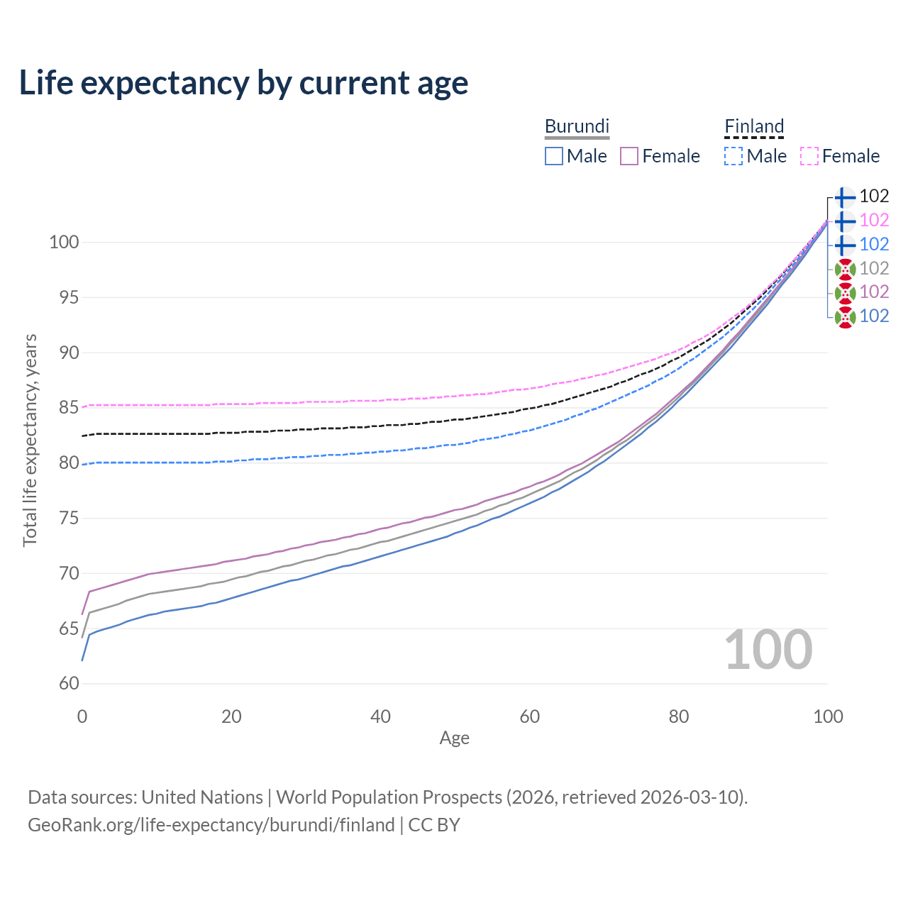 This life expectancy calculator shows the odds of living to 100, 95, 90, and below based on current age for both males and females in Burundi and Finland, along with mean and median age of death. The calculations are based on the 2026 life tables (actuarial tables) from the UN World Population Prospects.