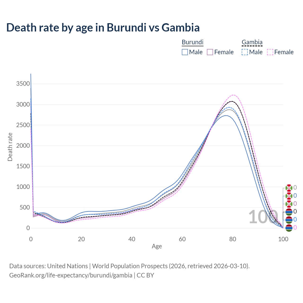 In Burundi, the most common age of death is 0, compared to 80 in the Gambia. The median age of death is 71.6 in Burundi and 73.4 in the Gambia, meaning only half of each cohort is expected to live past that age.