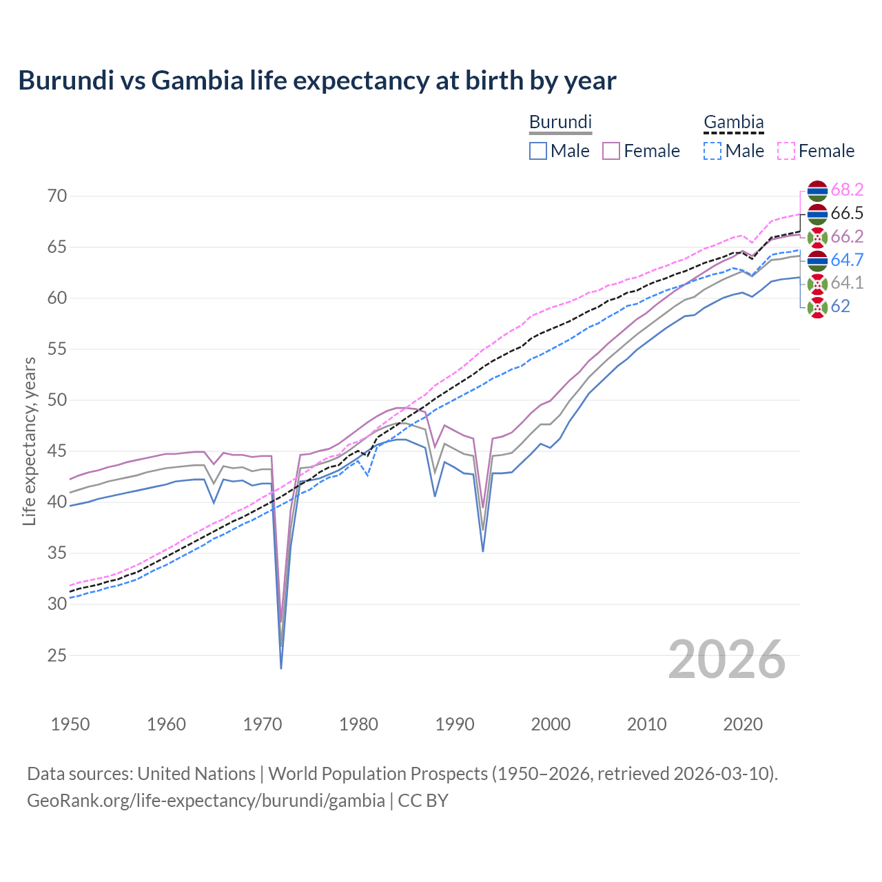 The average life expectancy at birth is 64.1 years in Burundi vs 66.5 in the Gambia. Burundi is ranked 179/197 by life expectancy, and the Gambia is 167/197. In Burundi, the life expectancy is 62 years for males and 66.2 years for females. In the Gambia, it's 64.7 years for males and 68.2 years for females.