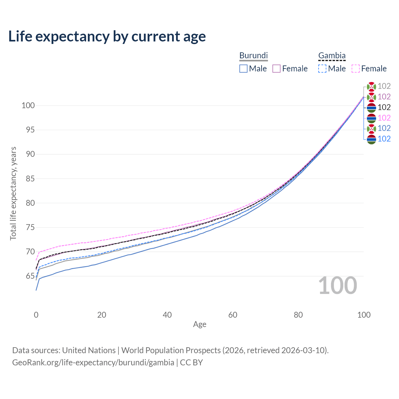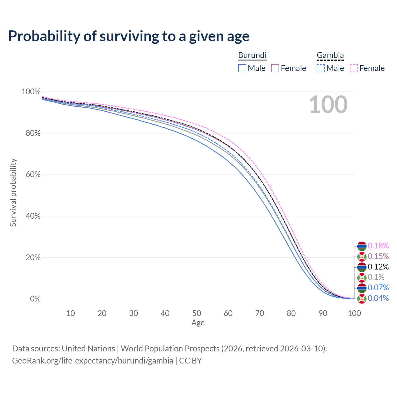 This life expectancy calculator shows the odds of living to 100, 95, 90, and below based on current age for both males and females in Burundi and the Gambia, along with mean and median age of death. The calculations are based on the 2026 life tables (actuarial tables) from the UN World Population Prospects.