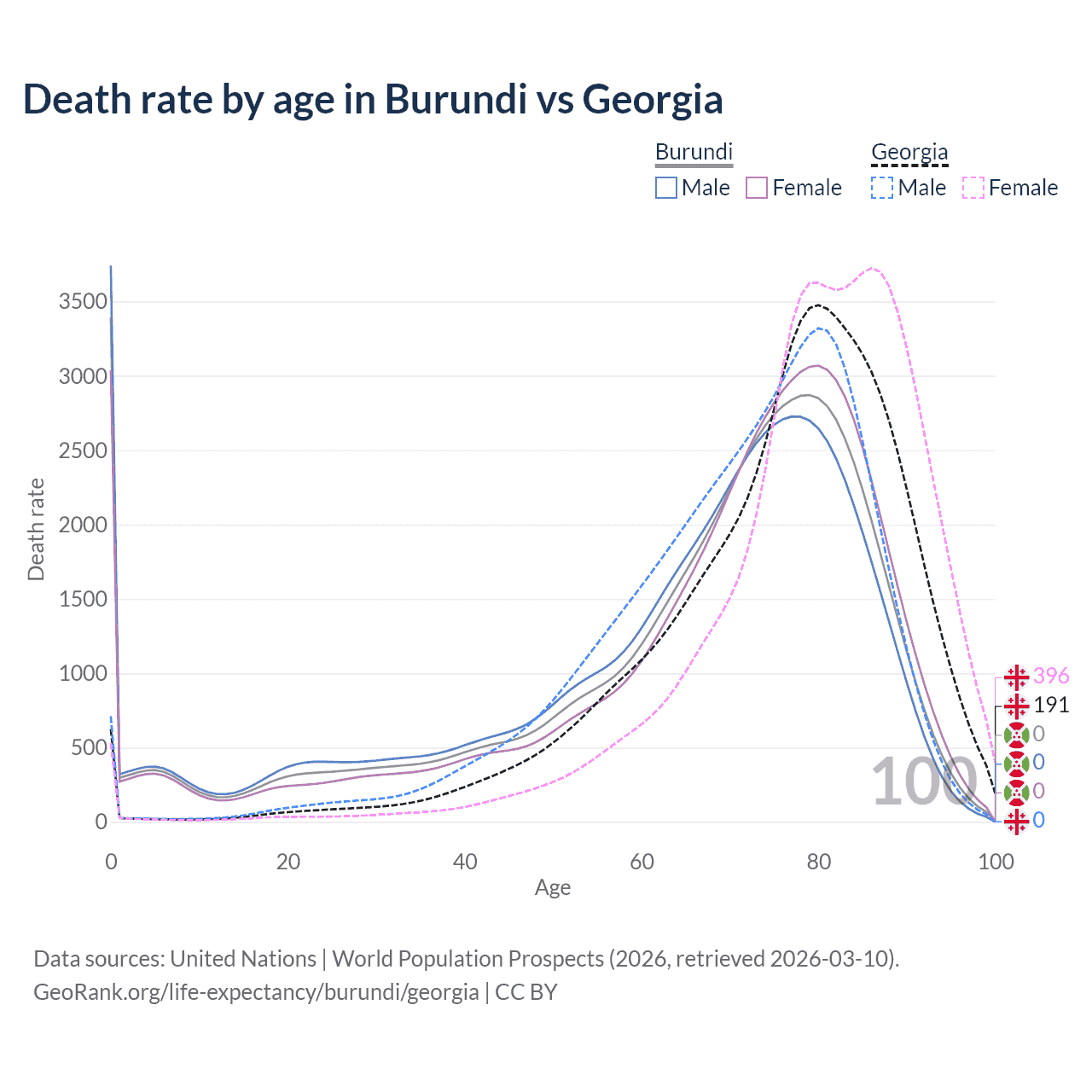 In Burundi, the most common age of death is 0, compared to 80 in Georgia. The median age of death is 71.6 in Burundi and 78.2 in Georgia, meaning only half of each cohort is expected to live past that age.