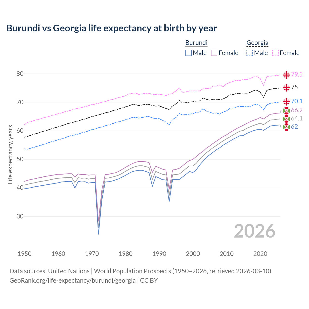 The average life expectancy at birth is 64.1 years in Burundi vs 75 in Georgia. Burundi is ranked 179/197 by life expectancy, and Georgia is 96/197. In Burundi, the life expectancy is 62 years for males and 66.2 years for females. In Georgia, it's 70.1 years for males and 79.5 years for females.