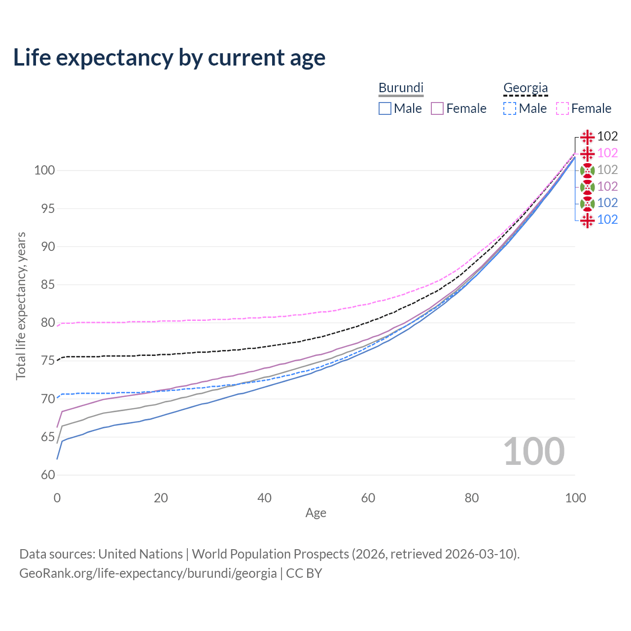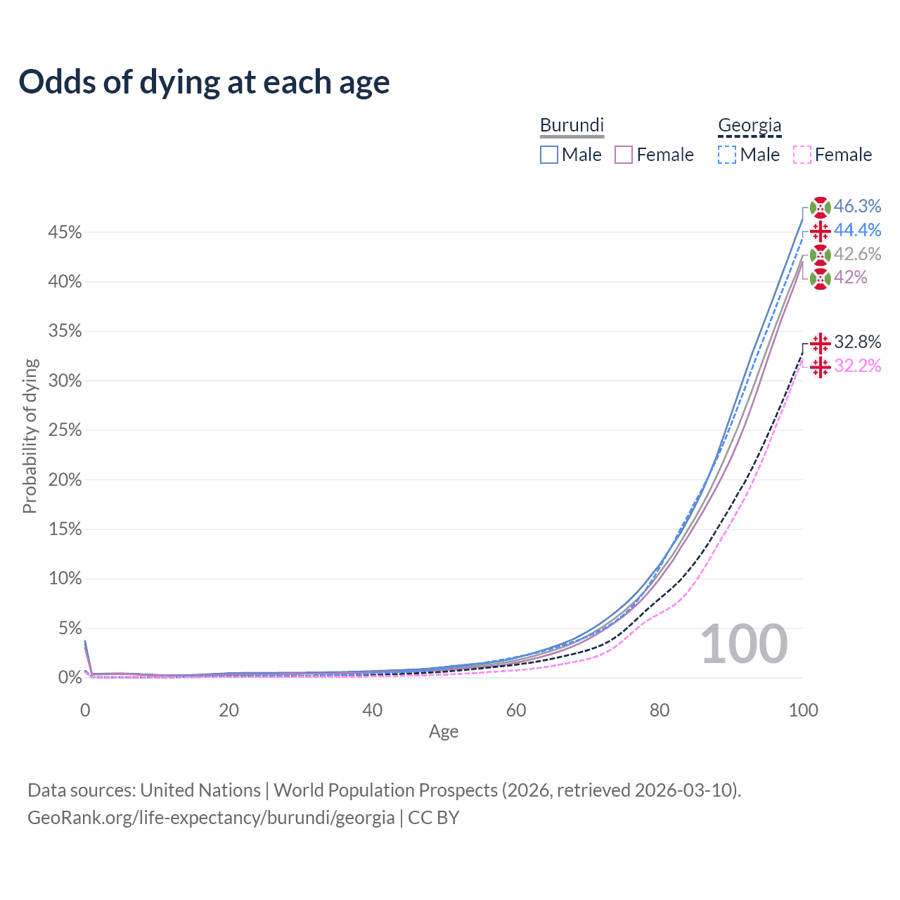 This life expectancy calculator shows the odds of living to 100, 95, 90, and below based on current age for both males and females in Burundi and Georgia, along with mean and median age of death. The calculations are based on the 2026 life tables (actuarial tables) from the UN World Population Prospects.