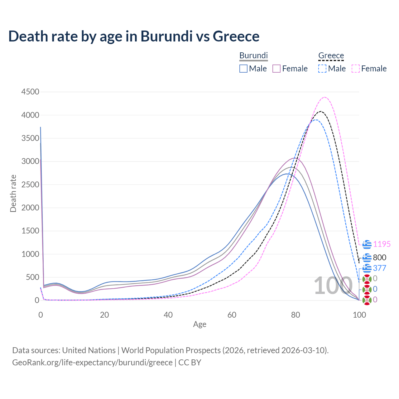 In Burundi, the most common age of death is 0, compared to 88 in Greece. The median age of death is 71.6 in Burundi and 84.9 in Greece, meaning only half of each cohort is expected to live past that age.