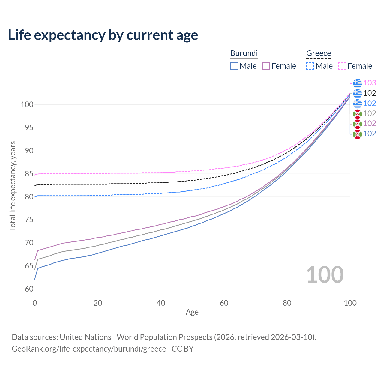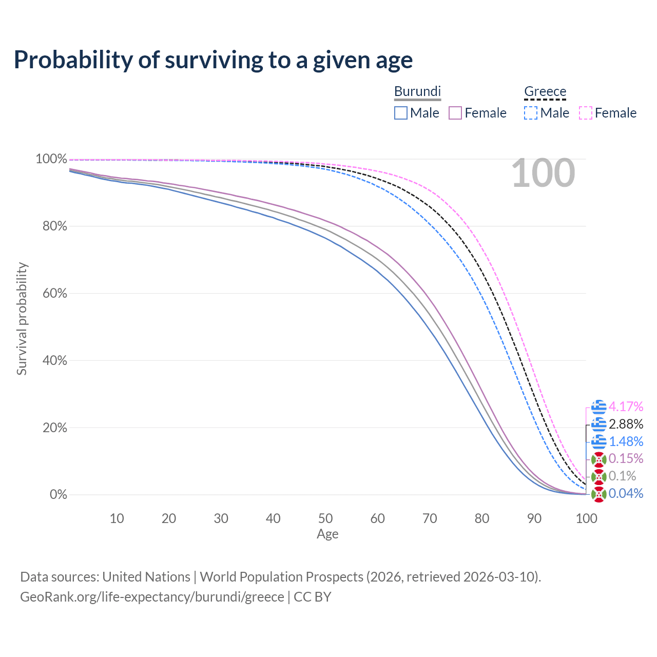 This life expectancy calculator shows the odds of living to 100, 95, 90, and below based on current age for both males and females in Burundi and Greece, along with mean and median age of death. The calculations are based on the 2026 life tables (actuarial tables) from the UN World Population Prospects.