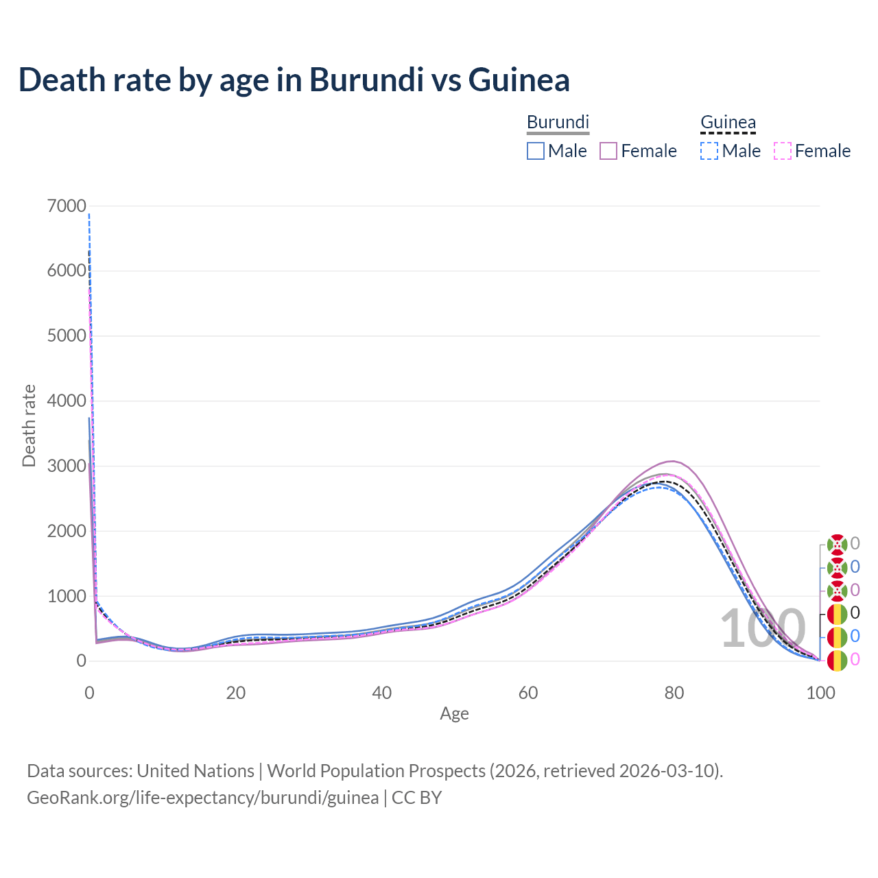 In Burundi, the most common age of death is 0, compared to 0 in Guinea. The median age of death is 71.6 in Burundi and 70.6 in Guinea, meaning only half of each cohort is expected to live past that age.