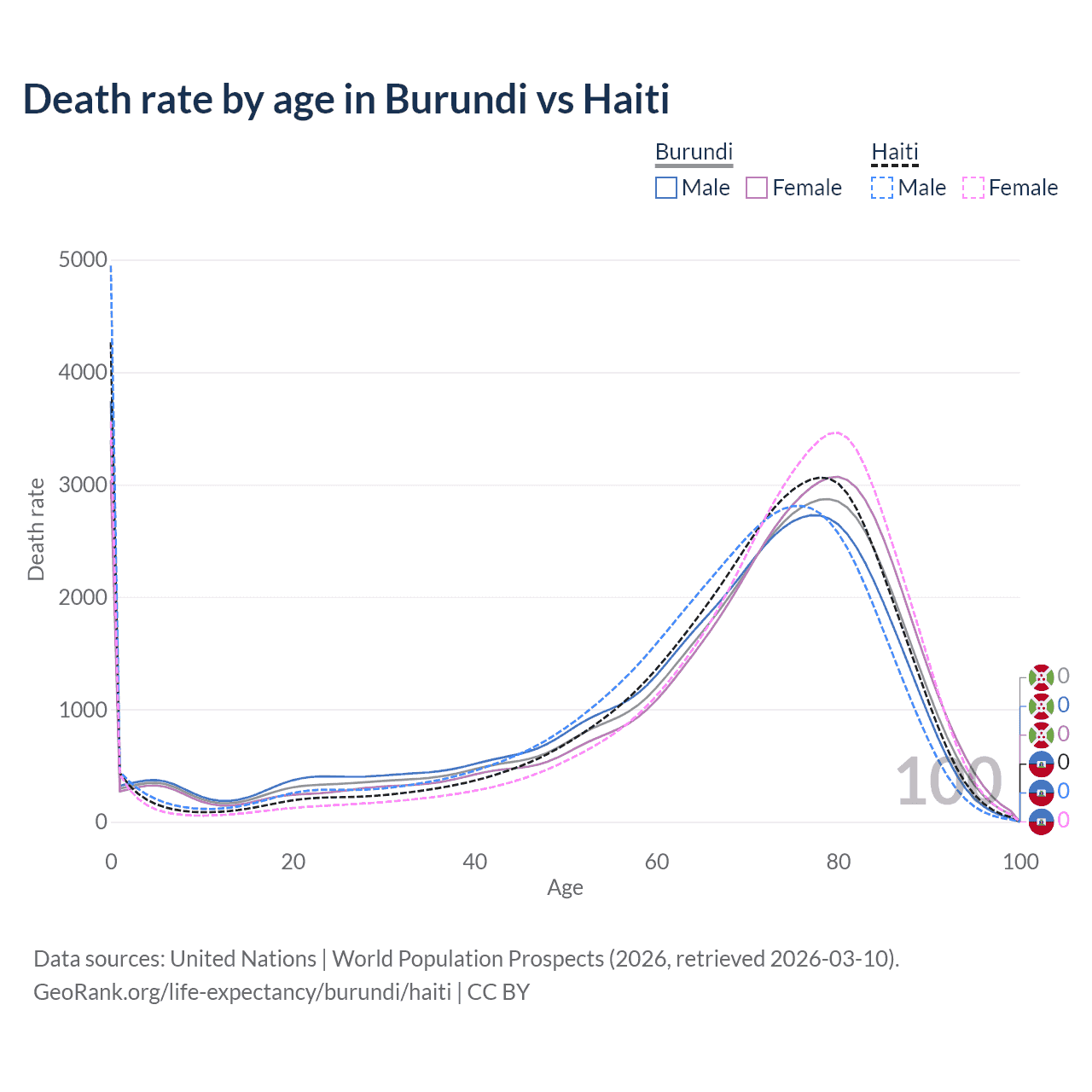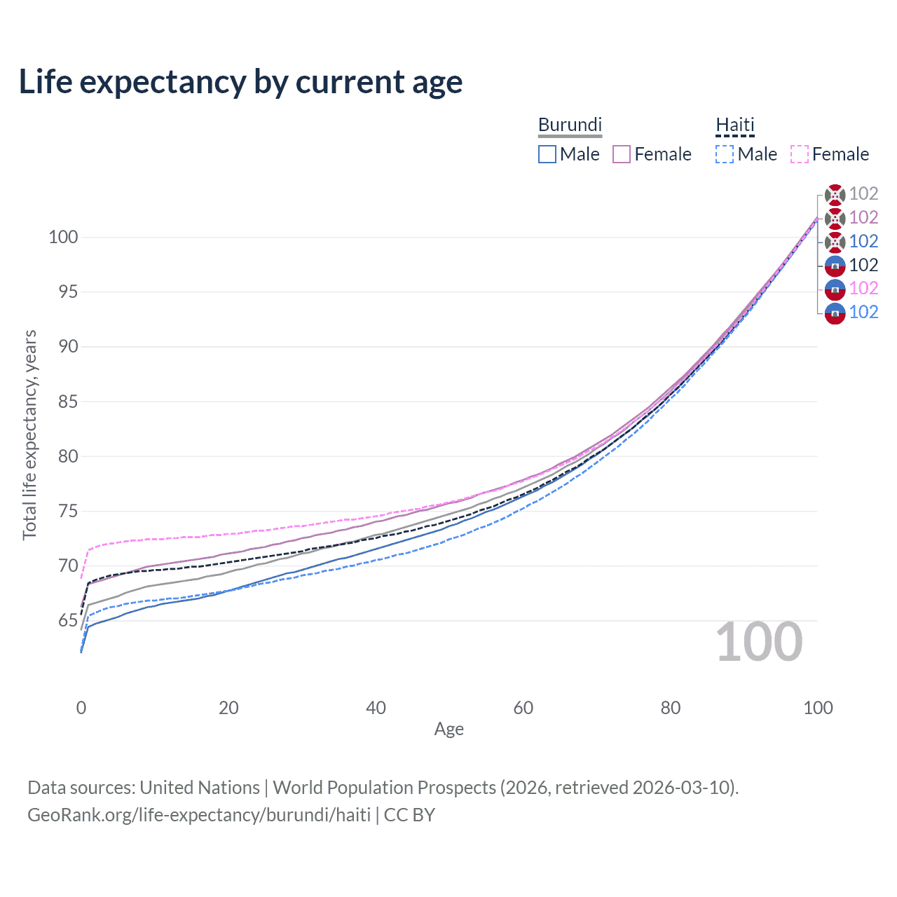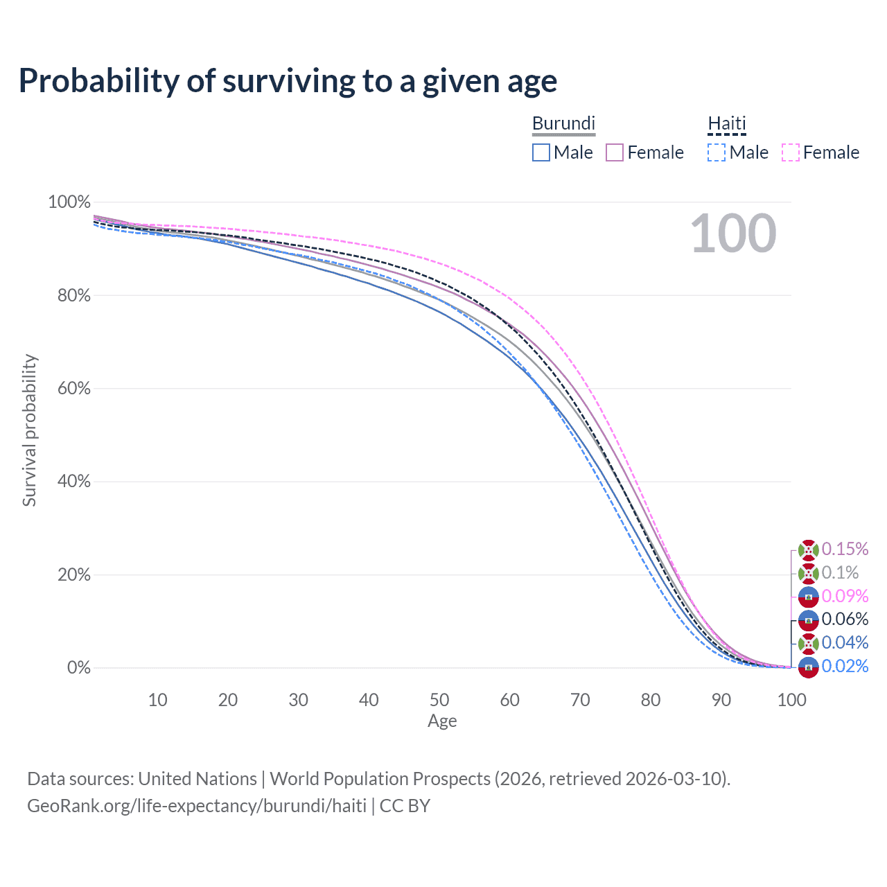 This life expectancy calculator shows the odds of living to 100, 95, 90, and below based on current age for both males and females in Burundi and Haiti, along with mean and median age of death. The calculations are based on the 2026 life tables (actuarial tables) from the UN World Population Prospects.