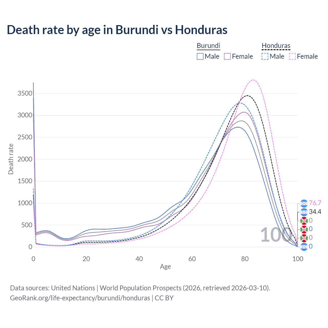 In Burundi, the most common age of death is 0, compared to 81 in Honduras. The median age of death is 71.6 in Burundi and 77.1 in Honduras, meaning only half of each cohort is expected to live past that age.