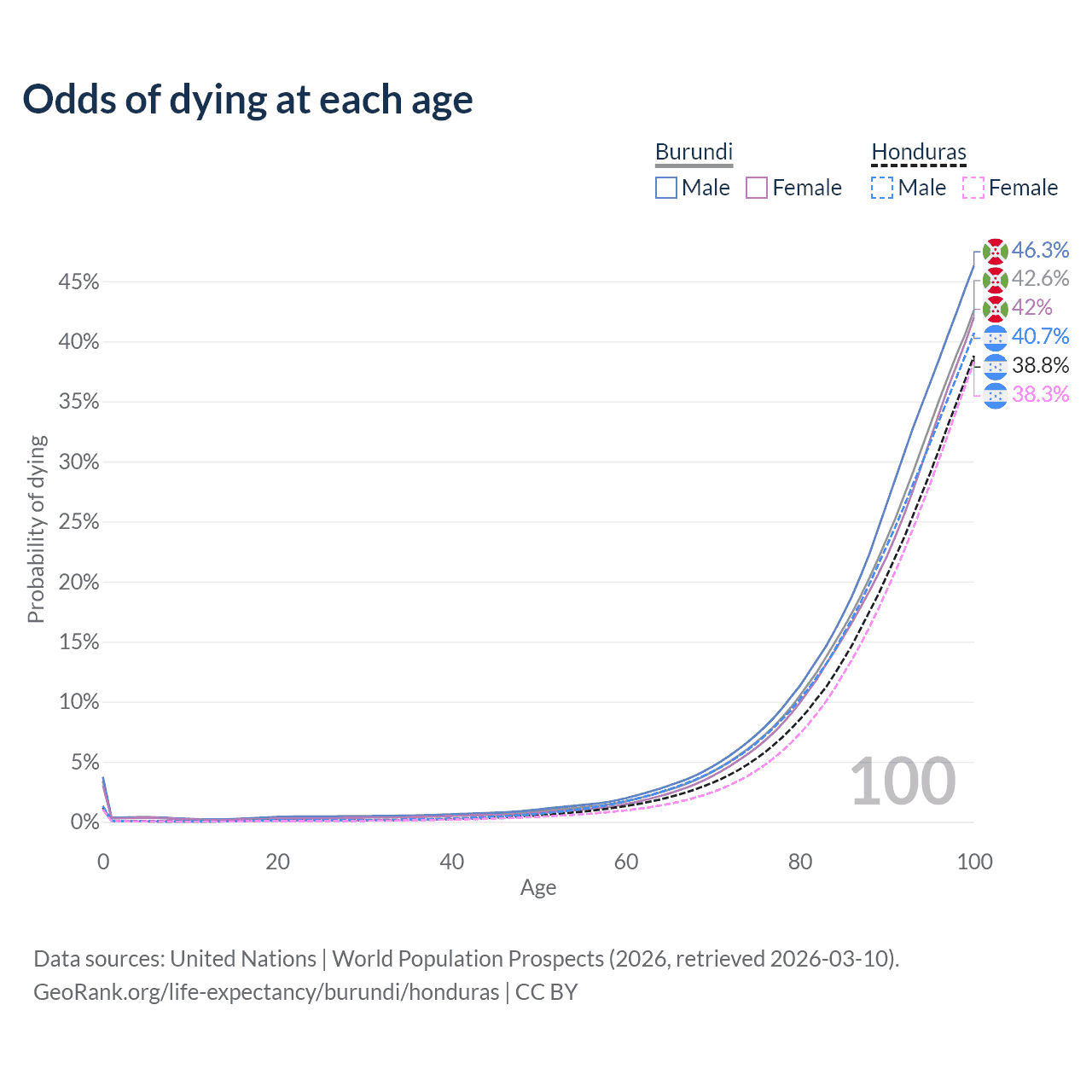 This life expectancy calculator shows the odds of living to 100, 95, 90, and below based on current age for both males and females in Burundi and Honduras, along with mean and median age of death. The calculations are based on the 2026 life tables (actuarial tables) from the UN World Population Prospects.