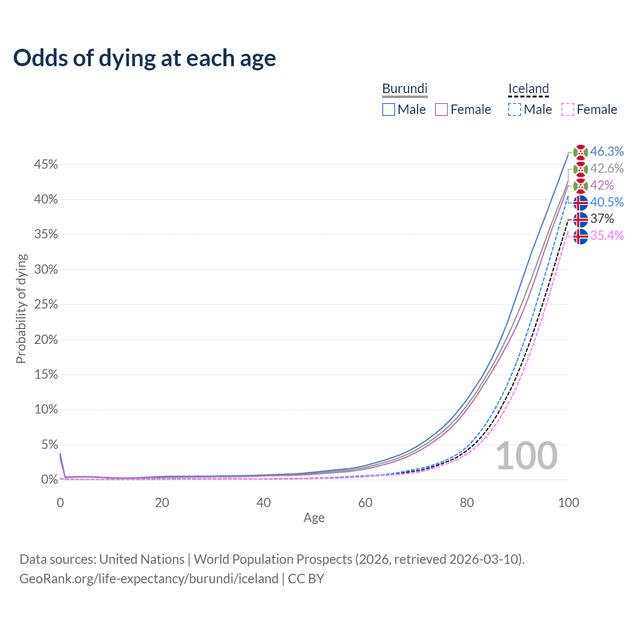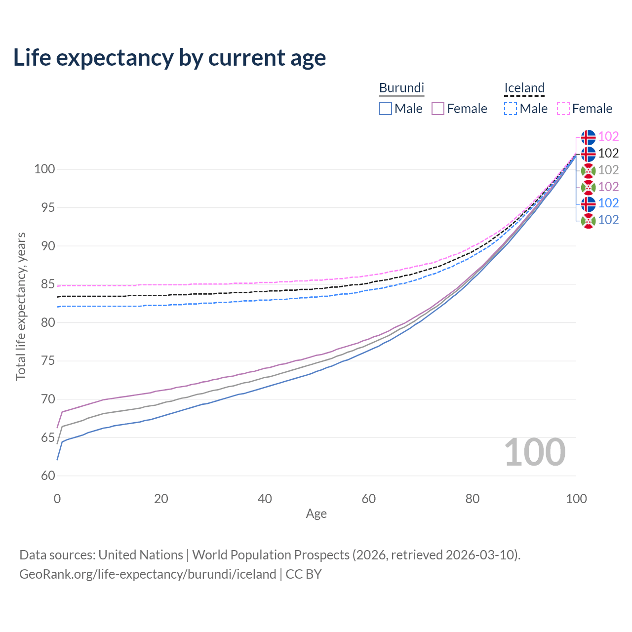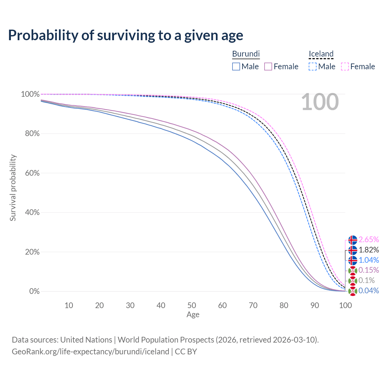 This life expectancy calculator shows the odds of living to 100, 95, 90, and below based on current age for both males and females in Burundi and Iceland, along with mean and median age of death. The calculations are based on the 2026 life tables (actuarial tables) from the UN World Population Prospects.