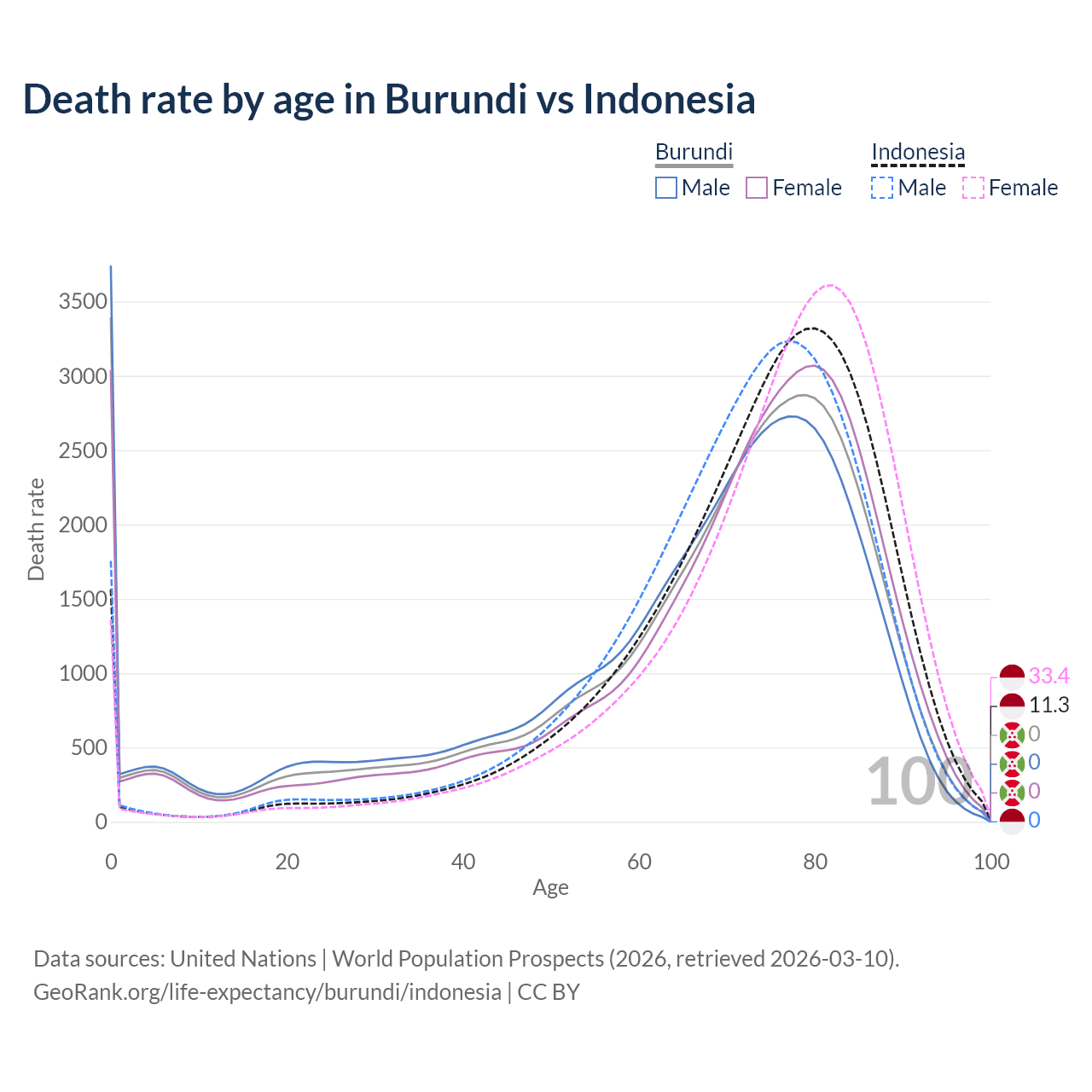 This life expectancy calculator shows the odds of living to 100, 95, 90, and below based on current age for both males and females in Burundi and Indonesia, along with mean and median age of death. The calculations are based on the 2026 life tables (actuarial tables) from the UN World Population Prospects.