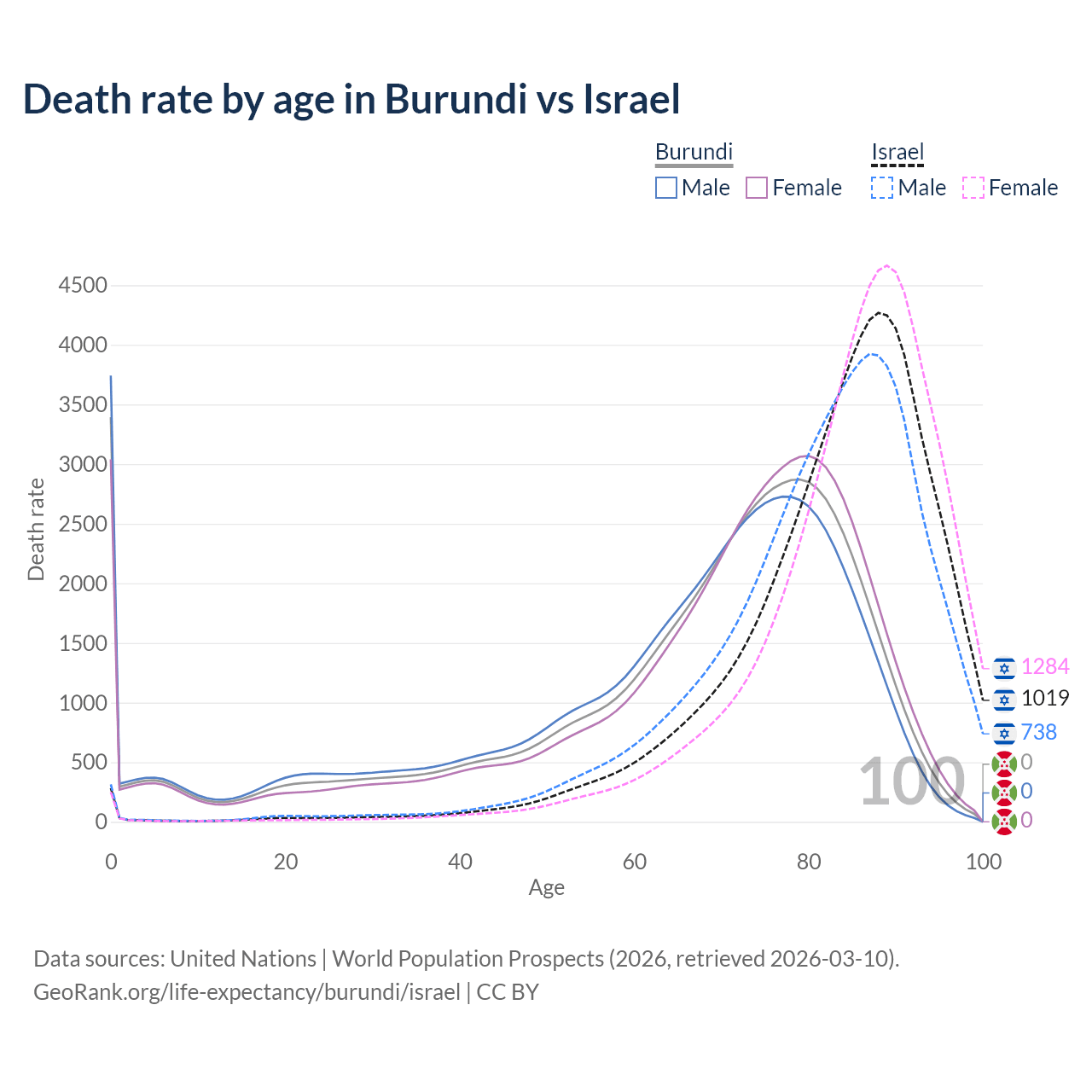 In Burundi, the most common age of death is 0, compared to 88 in Israel. The median age of death is 71.6 in Burundi and 85.6 in Israel, meaning only half of each cohort is expected to live past that age.