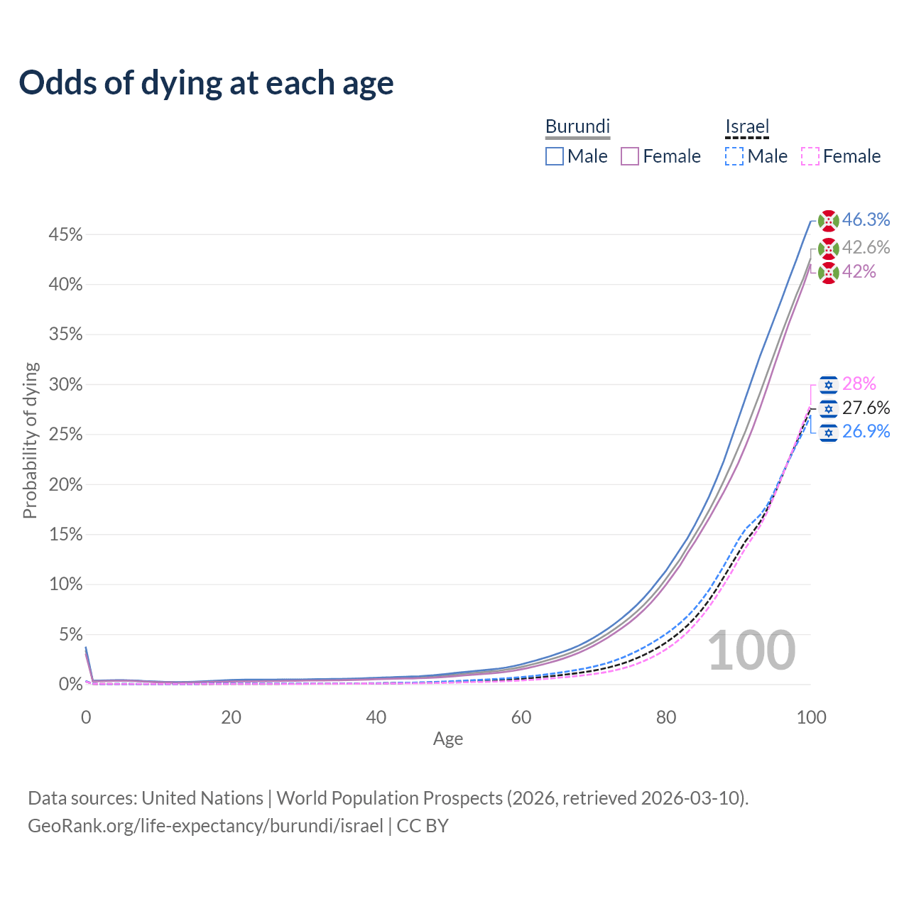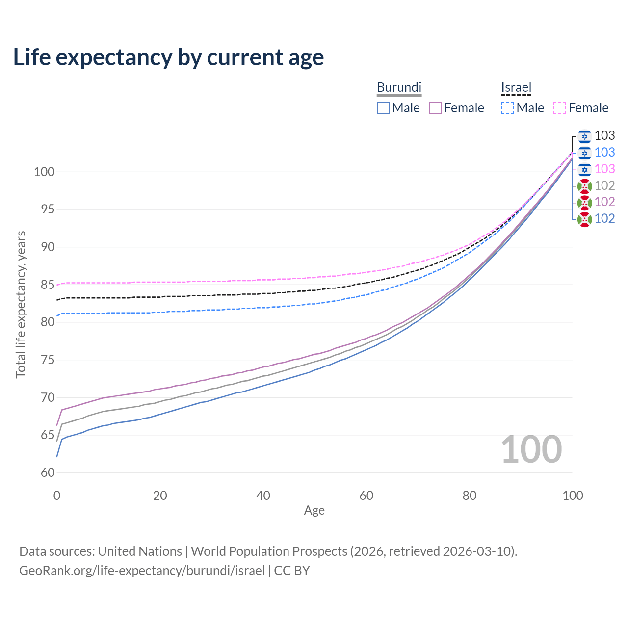This life expectancy calculator shows the odds of living to 100, 95, 90, and below based on current age for both males and females in Burundi and Israel, along with mean and median age of death. The calculations are based on the 2026 life tables (actuarial tables) from the UN World Population Prospects.