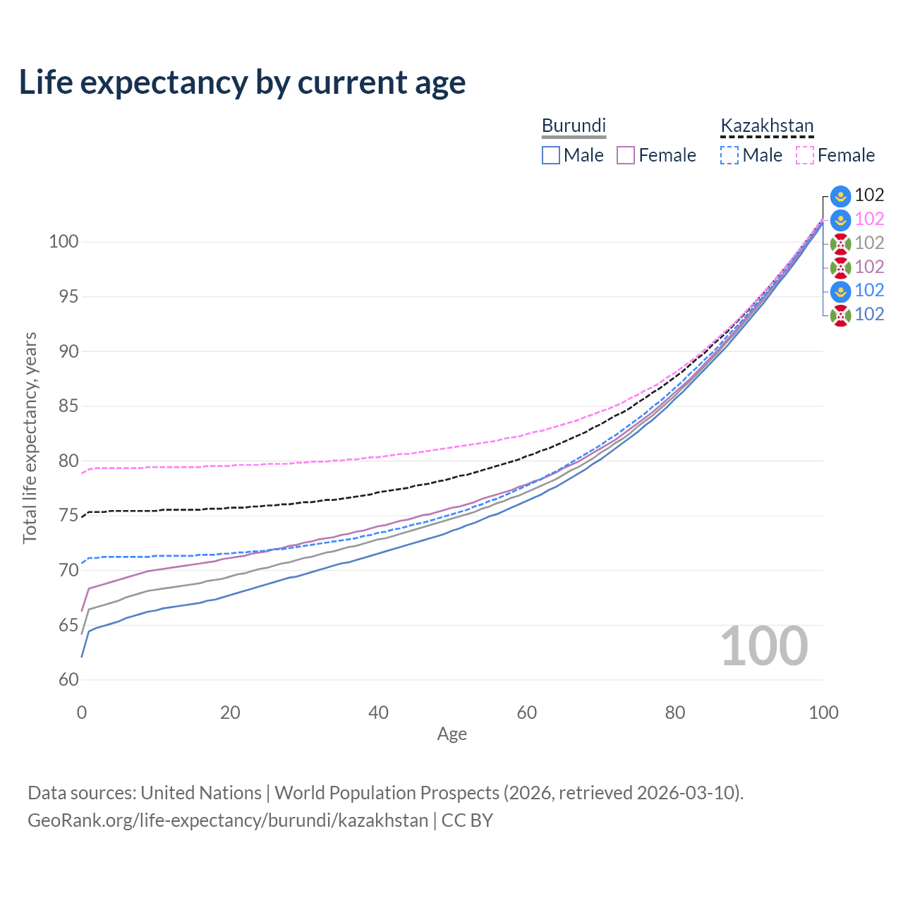 This life expectancy calculator shows the odds of living to 100, 95, 90, and below based on current age for both males and females in Burundi and Kazakhstan, along with mean and median age of death. The calculations are based on the 2026 life tables (actuarial tables) from the UN World Population Prospects.