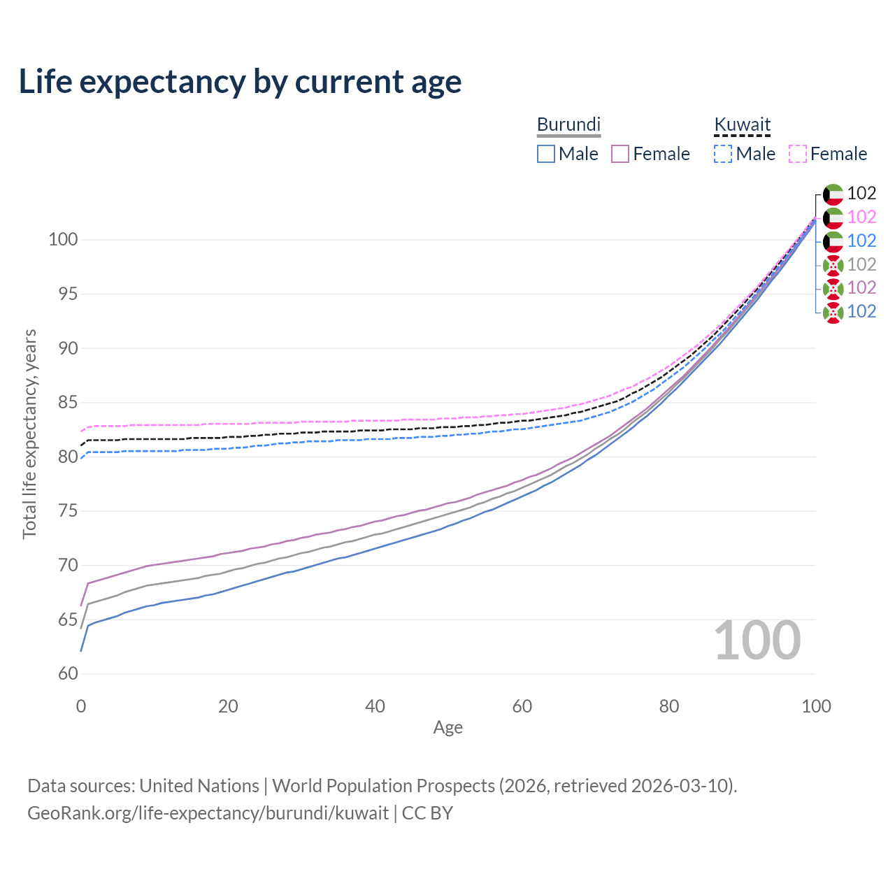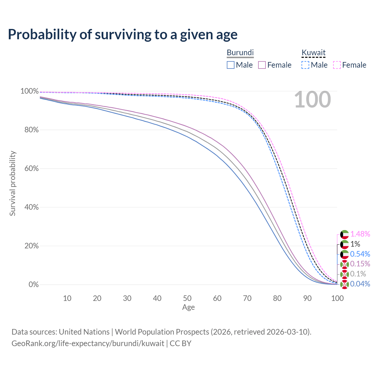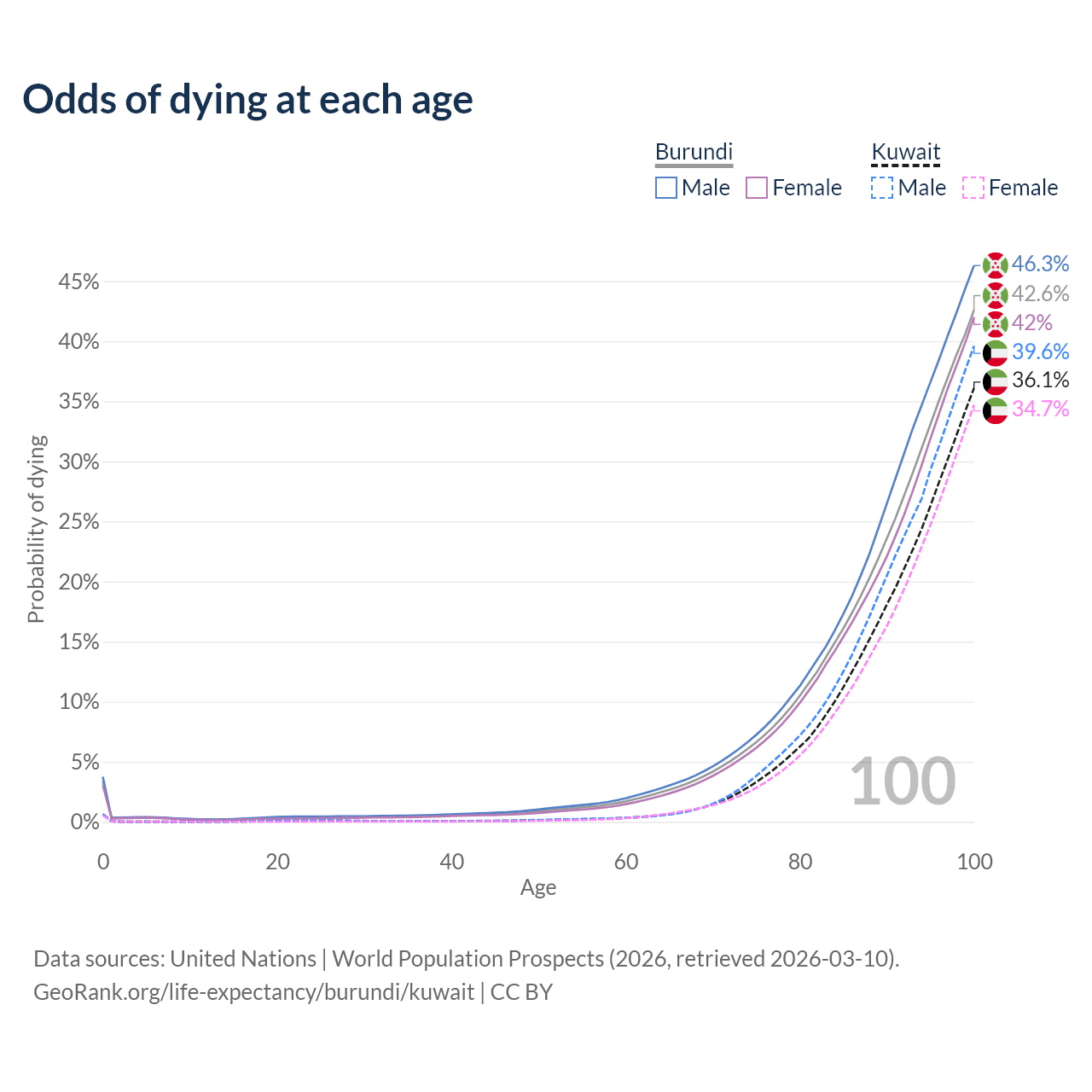 This life expectancy calculator shows the odds of living to 100, 95, 90, and below based on current age for both males and females in Burundi and Kuwait, along with mean and median age of death. The calculations are based on the 2026 life tables (actuarial tables) from the UN World Population Prospects.