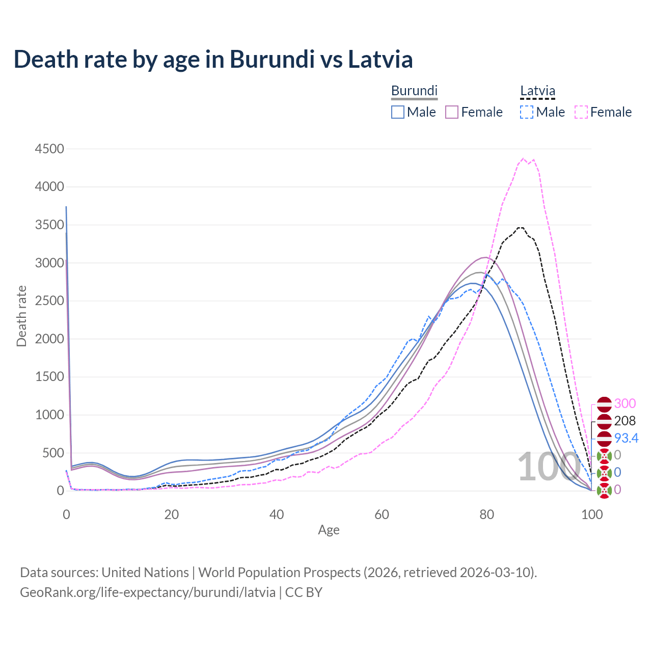 In Burundi, the most common age of death is 0, compared to 87 in Latvia. The median age of death is 71.6 in Burundi and 80.4 in Latvia, meaning only half of each cohort is expected to live past that age.