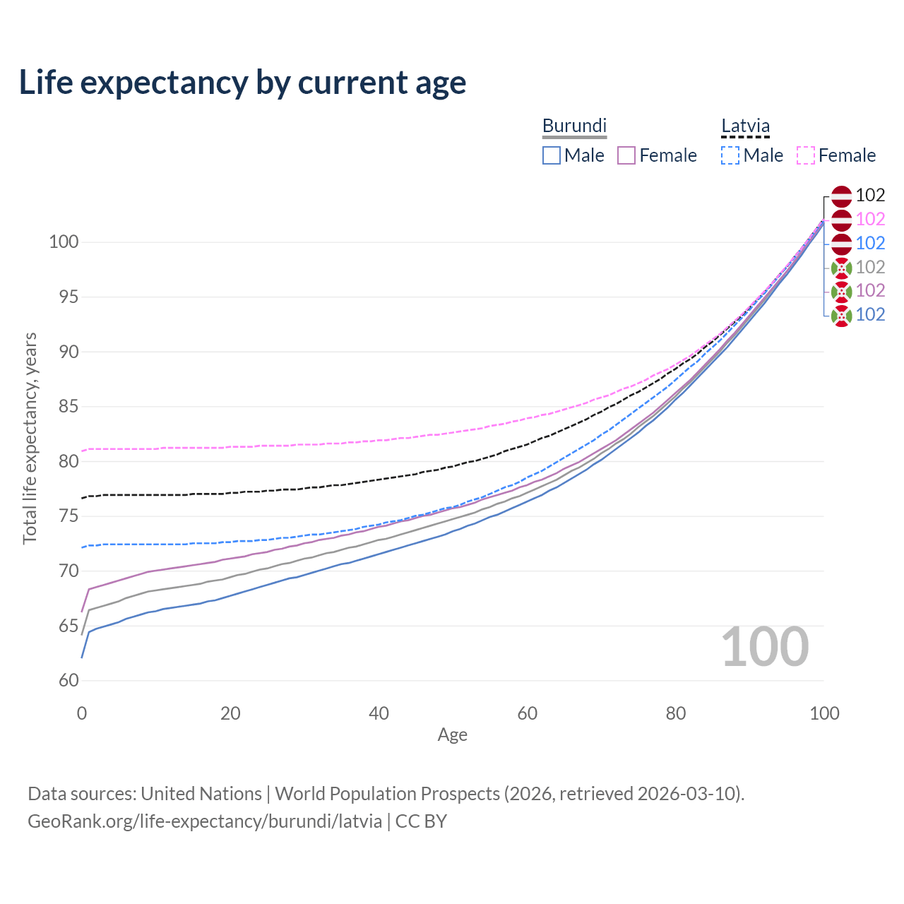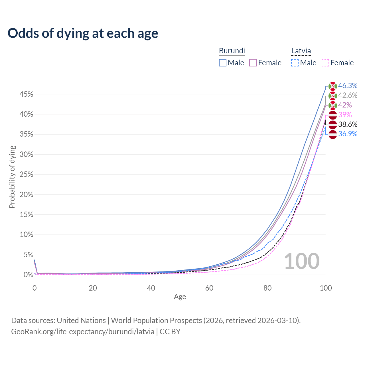This life expectancy calculator shows the odds of living to 100, 95, 90, and below based on current age for both males and females in Burundi and Latvia, along with mean and median age of death. The calculations are based on the 2026 life tables (actuarial tables) from the UN World Population Prospects.