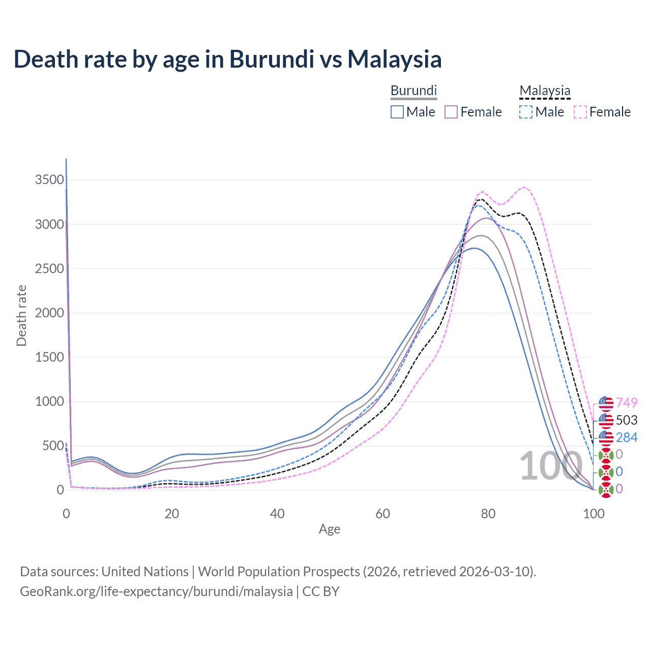 In Burundi, the most common age of death is 0, compared to 79 in Malaysia. The median age of death is 71.6 in Burundi and 79.8 in Malaysia, meaning only half of each cohort is expected to live past that age.