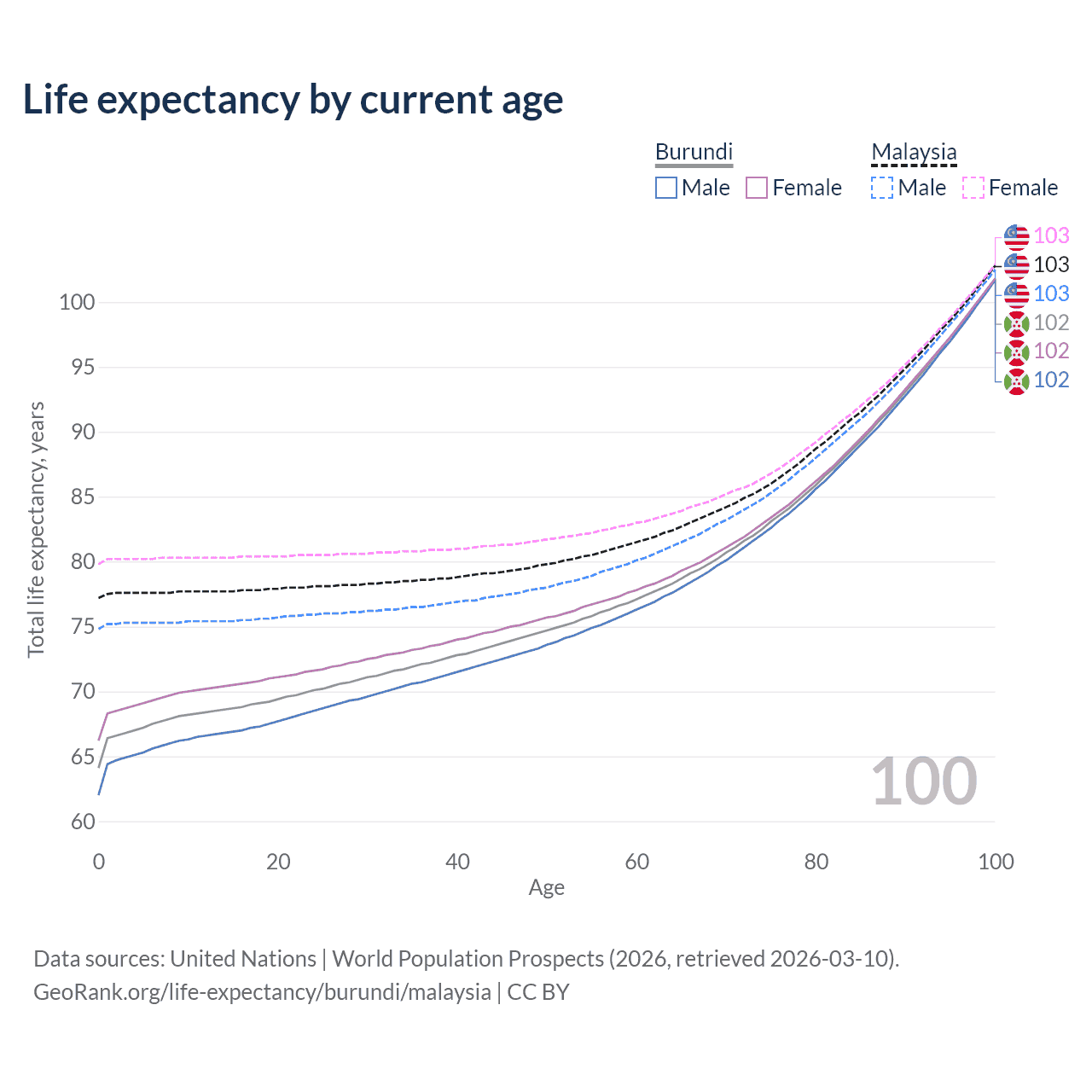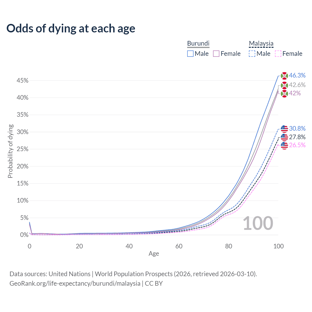 This life expectancy calculator shows the odds of living to 100, 95, 90, and below based on current age for both males and females in Burundi and Malaysia, along with mean and median age of death. The calculations are based on the 2026 life tables (actuarial tables) from the UN World Population Prospects.