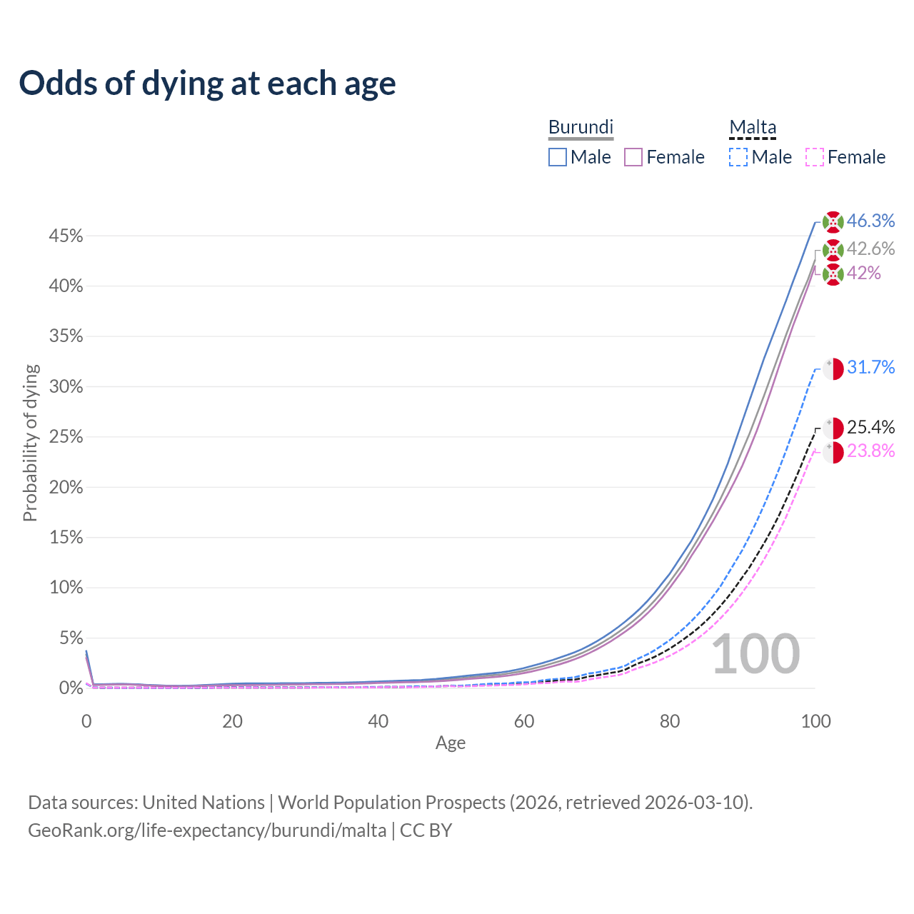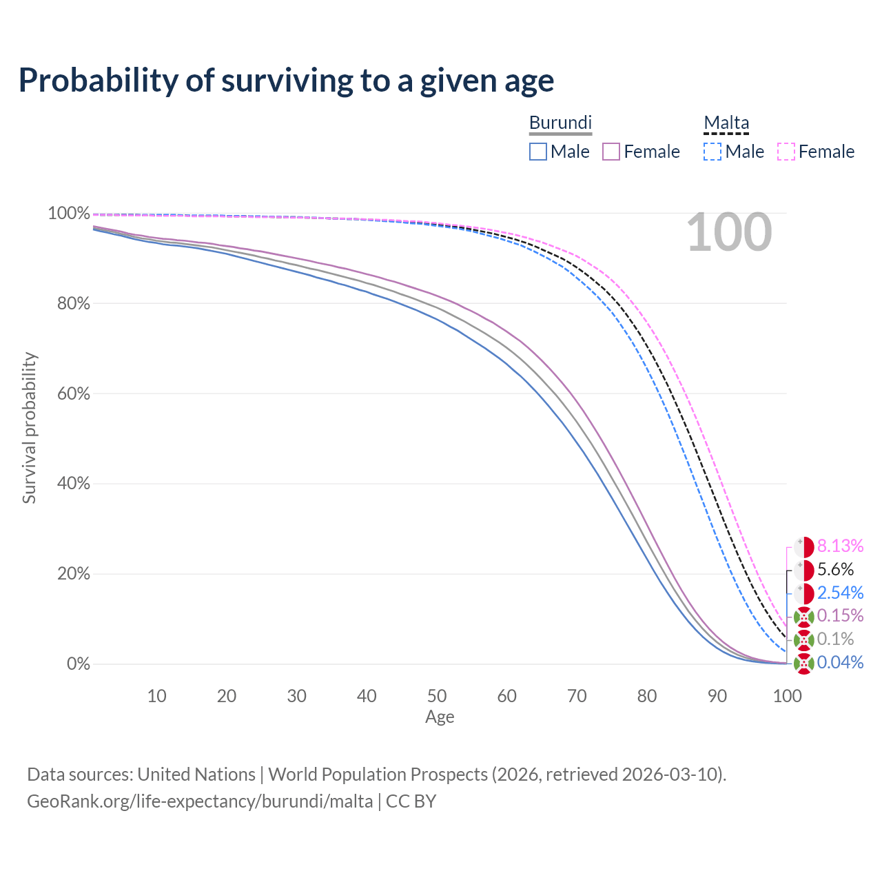 This life expectancy calculator shows the odds of living to 100, 95, 90, and below based on current age for both males and females in Burundi and Malta, along with mean and median age of death. The calculations are based on the 2026 life tables (actuarial tables) from the UN World Population Prospects.