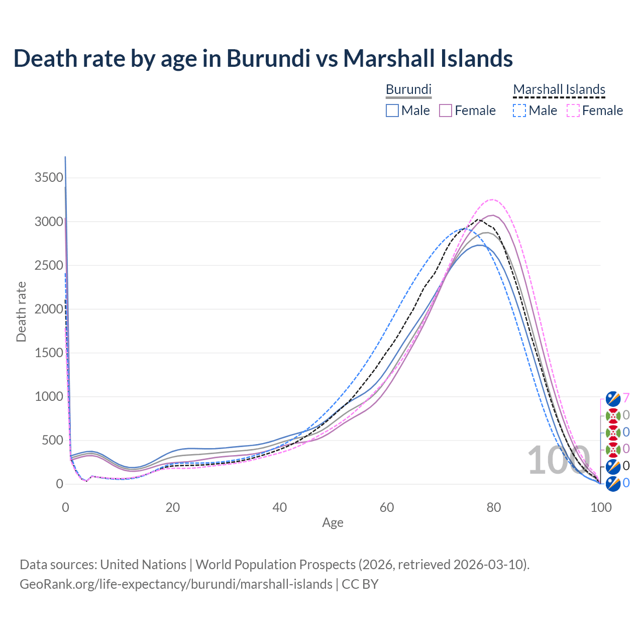 In Burundi, the most common age of death is 0, compared to 77 in the Marshall Islands. The median age of death is 71.6 in Burundi and 72 in the Marshall Islands, meaning only half of each cohort is expected to live past that age.