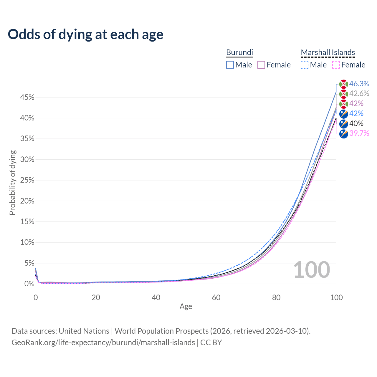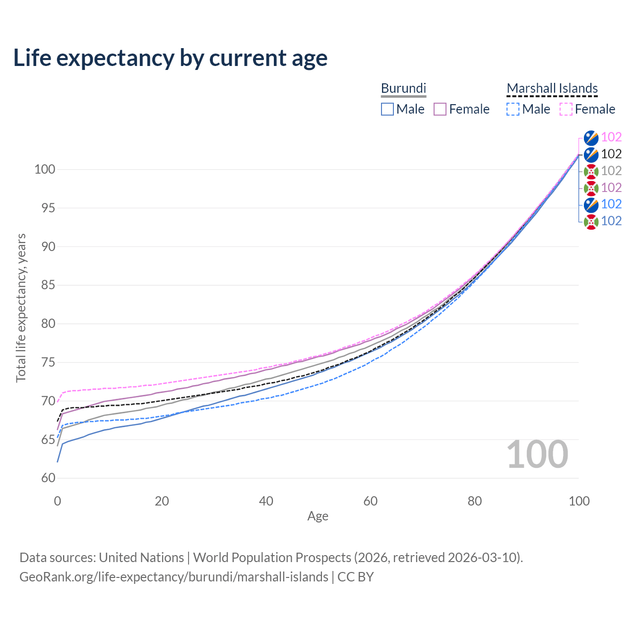 This life expectancy calculator shows the odds of living to 100, 95, 90, and below based on current age for both males and females in Burundi and the Marshall Islands, along with mean and median age of death. The calculations are based on the 2026 life tables (actuarial tables) from the UN World Population Prospects.