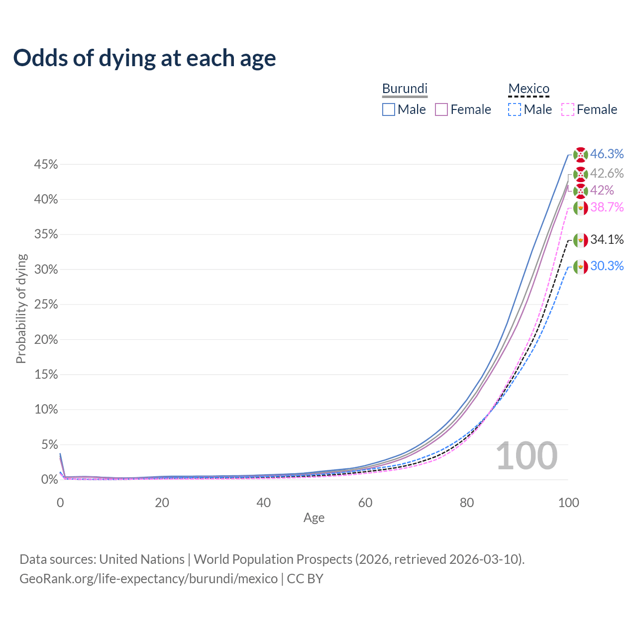 This life expectancy calculator shows the odds of living to 100, 95, 90, and below based on current age for both males and females in Burundi and Mexico, along with mean and median age of death. The calculations are based on the 2026 life tables (actuarial tables) from the UN World Population Prospects.