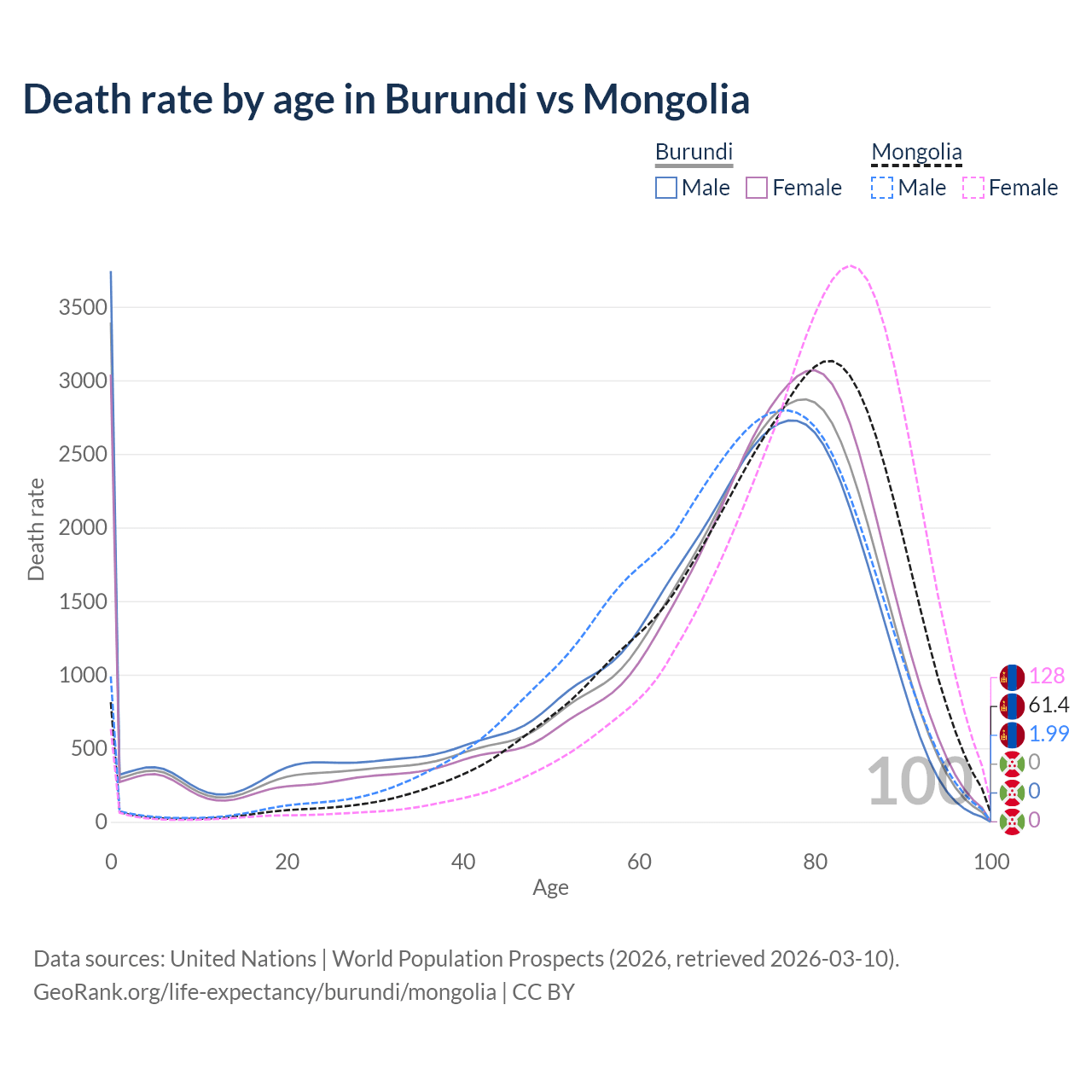 In Burundi, the most common age of death is 0, compared to 82 in Mongolia. The median age of death is 71.6 in Burundi and 76 in Mongolia, meaning only half of each cohort is expected to live past that age.