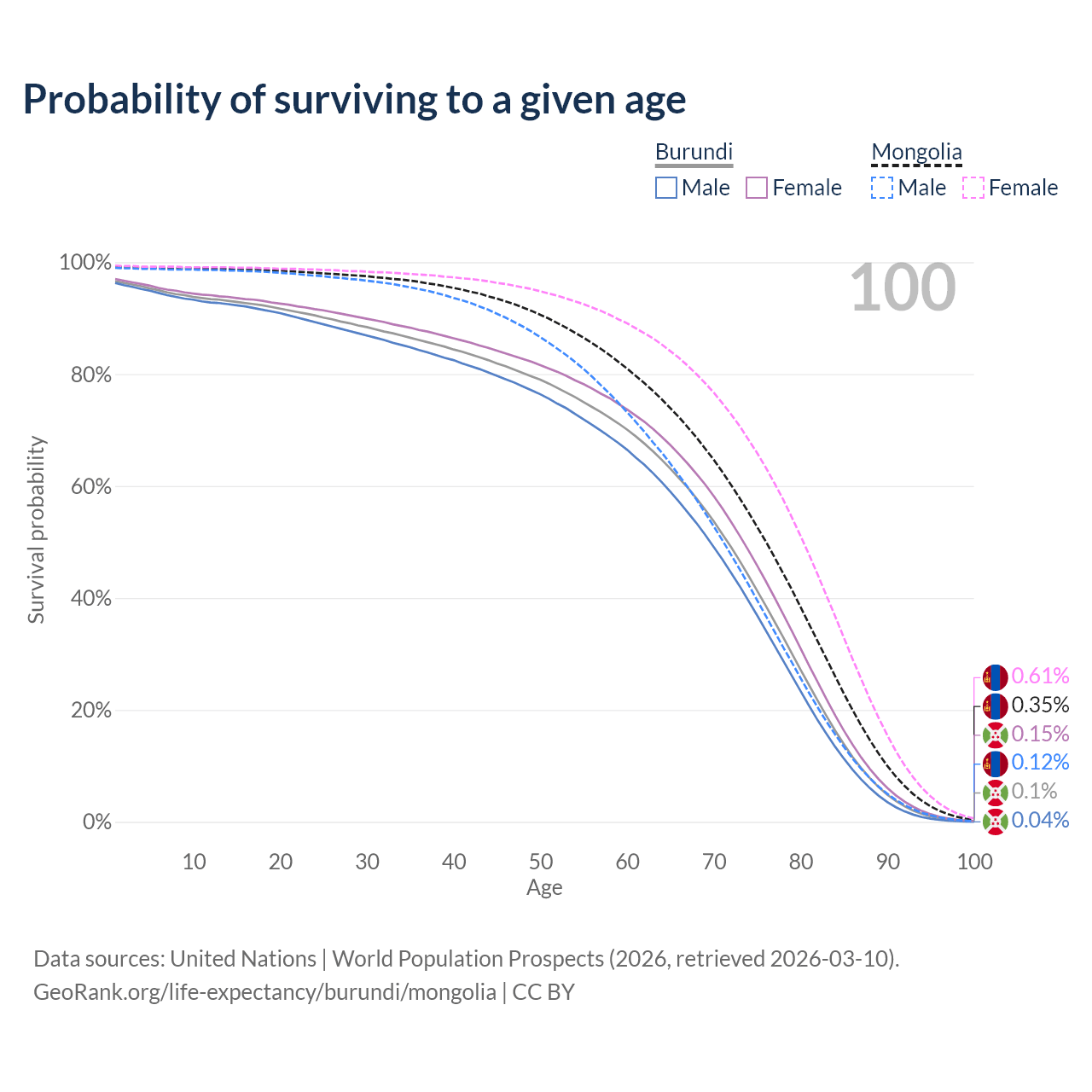 This life expectancy calculator shows the odds of living to 100, 95, 90, and below based on current age for both males and females in Burundi and Mongolia, along with mean and median age of death. The calculations are based on the 2026 life tables (actuarial tables) from the UN World Population Prospects.